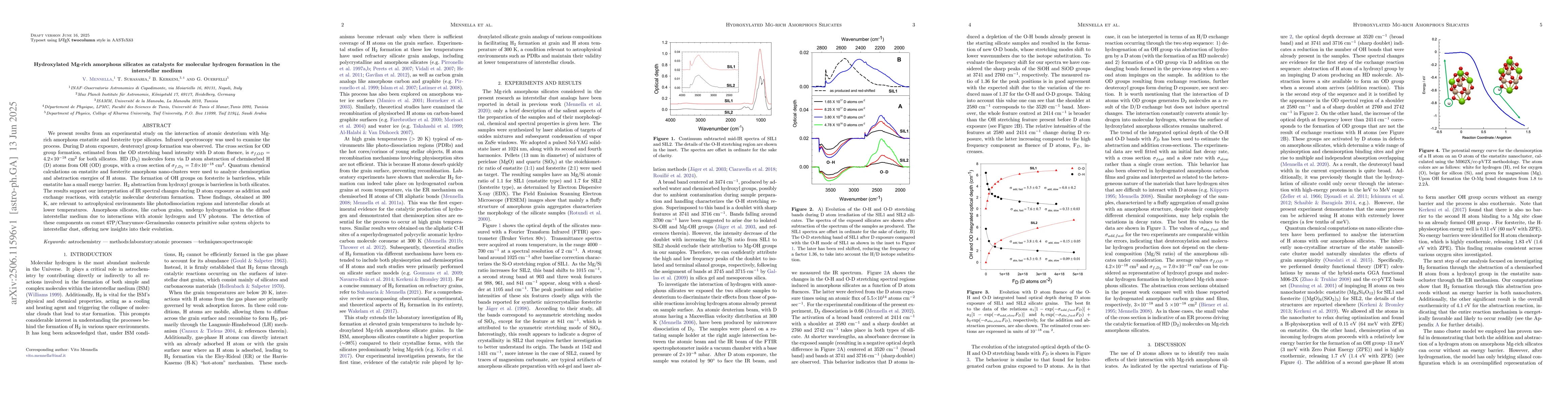 We present results from an experimental study on the interaction of atomic deuterium with Mg-rich amorphous enstatite and forsterite type silicates. Infrared spectroscopy was used to examine the process. During D atom exposure, deuteroxyl group formation was observed. The cross section for OD group formation, estimated from the OD stretching band intensity with D atom fluence, is 4.2.10^{-18} cm^2 for both silicates. HD (D2) molecules form via D atom abstraction of chemisorbed H(D) atoms from OH (OD) groups, with a cross section of 7.0.10^{-18} cm^2. Quantum chemical calculations on enstatite and forsterite amorphous nano-clusters were used to analyze chemisorption and abstraction energies of H atoms. The formation of OH groups on forsterite is barrierless, while enstatite has a small energy barrier. H2 abstraction from hydroxyl groups is barrierless in both silicates. The results support our interpretation of IR spectral changes during D atom exposure as addition and exchange reactions, with catalytic molecular deuterium formation. These findings, obtained at 300 K, are relevant to astrophysical environments like photodissociation regions and interstellar clouds at lower temperatures. Amorphous silicates, like carbon grains, undergo hydrogenation in the diffuse interstellar medium due to interactions with atomic hydrogen and UV photons. The detection of these components on comet 67P/Churyumov-Gerasimenko connects primitive solar system objects to interstellar dust, offering new insights into their evolution.