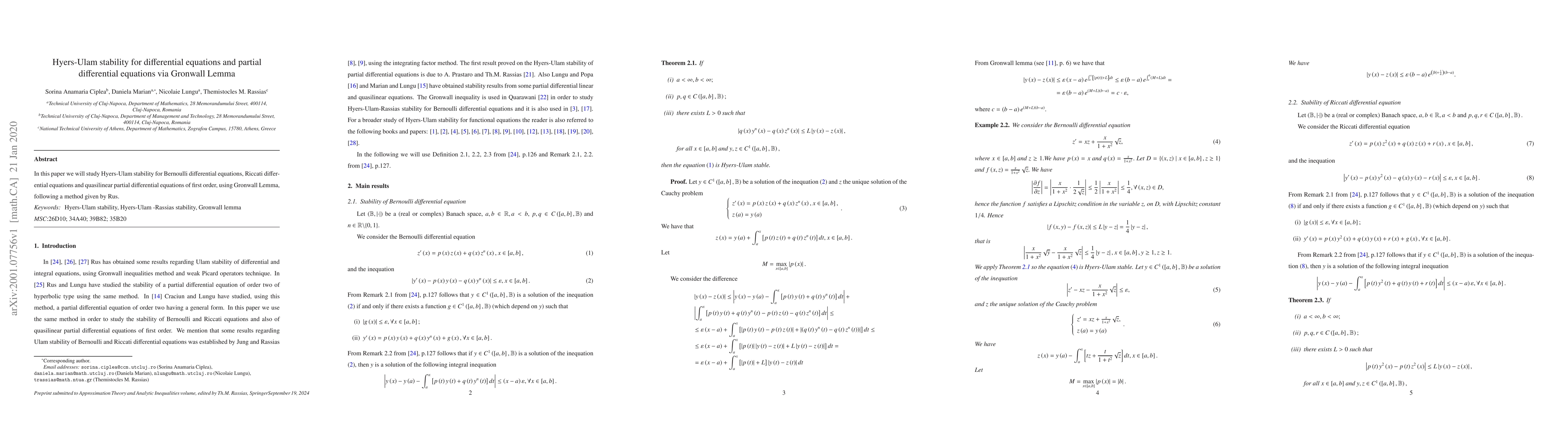 This paper investigates Hyers-Ulam stability for Bernoulli and Riccati differential equations, as well as first-order quasilinear partial differential equations, employing the Gronwall Lemma to establish stability results based on Rus's method.