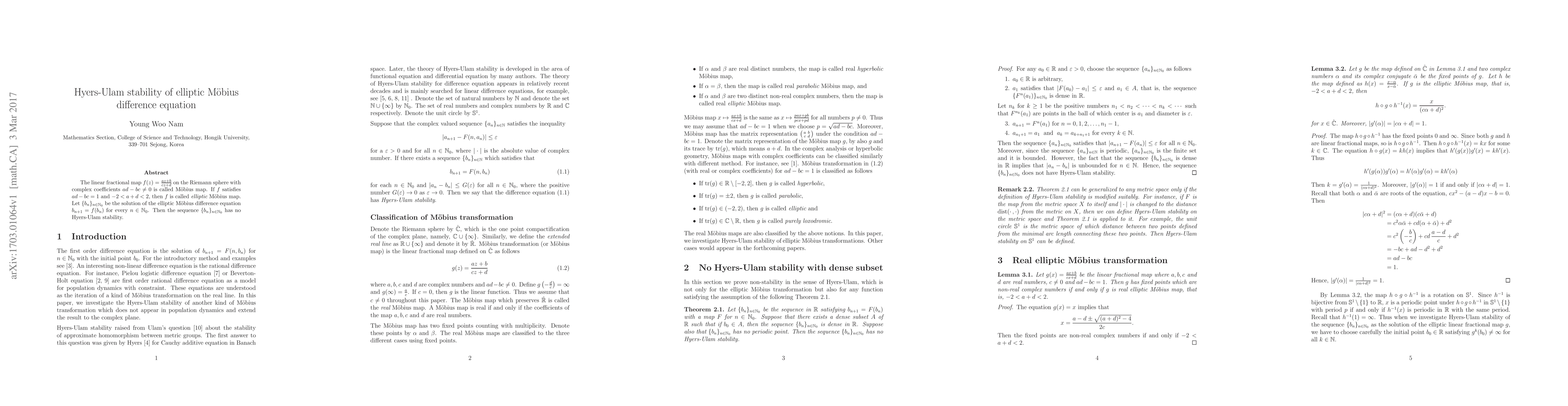 This research investigates the Hyers-Ulam stability of elliptic Möbius difference equations. It concludes that the sequence generated by these equations does not exhibit Hyers-Ulam stability under specified conditions.