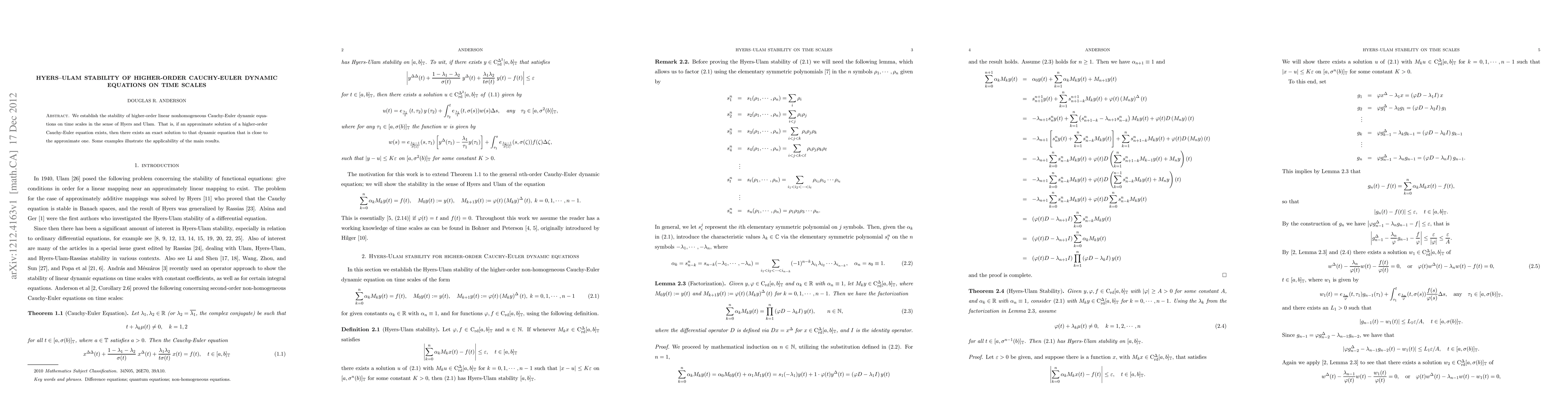 Summary: This paper proves the Hyers-Ulam stability for higher-order linear non-homogeneous Cauchy-Euler dynamic equations on time scales, demonstrating that approximate solutions can be closely approximated by exact solutions.
