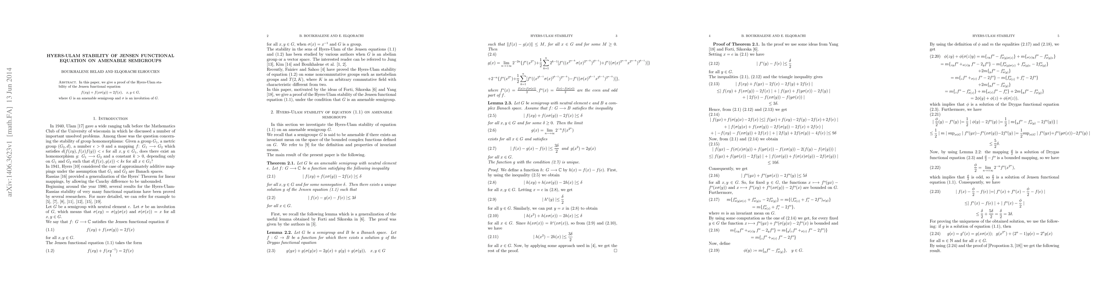 This paper proves the Hyers-Ulam stability of the Jensen functional equation on amenable semigroups, demonstrating that any approximately additive solution will be exact. The equation involves an involution $\sigma$ on the semigroup $G$.