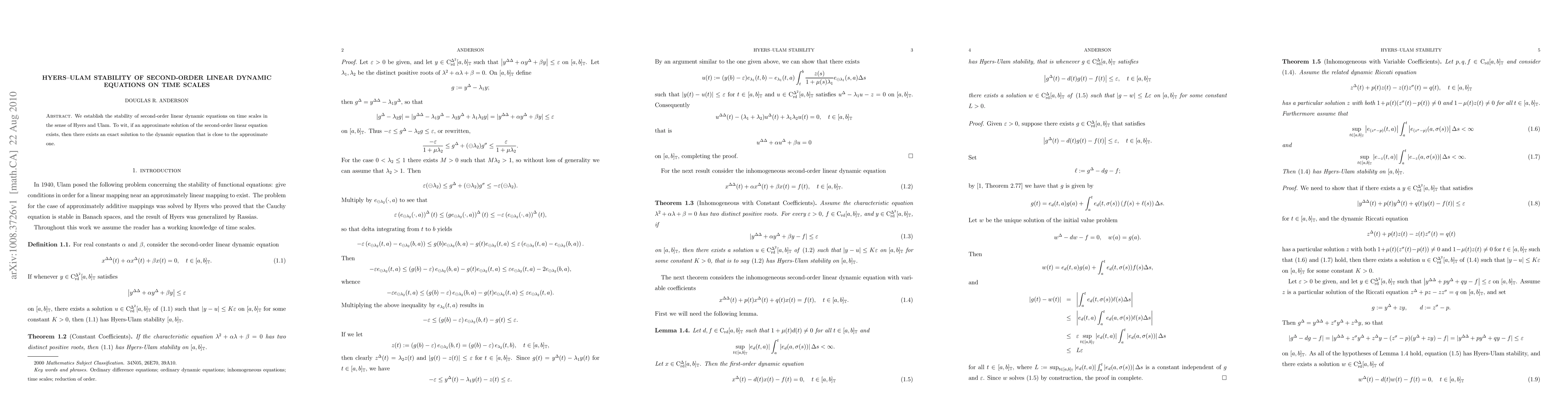 Summary: This paper proves the Hyers-Ulam stability for second-order linear dynamic equations on time scales, demonstrating that any approximate solution can be closely matched by an exact solution of the dynamic equation.