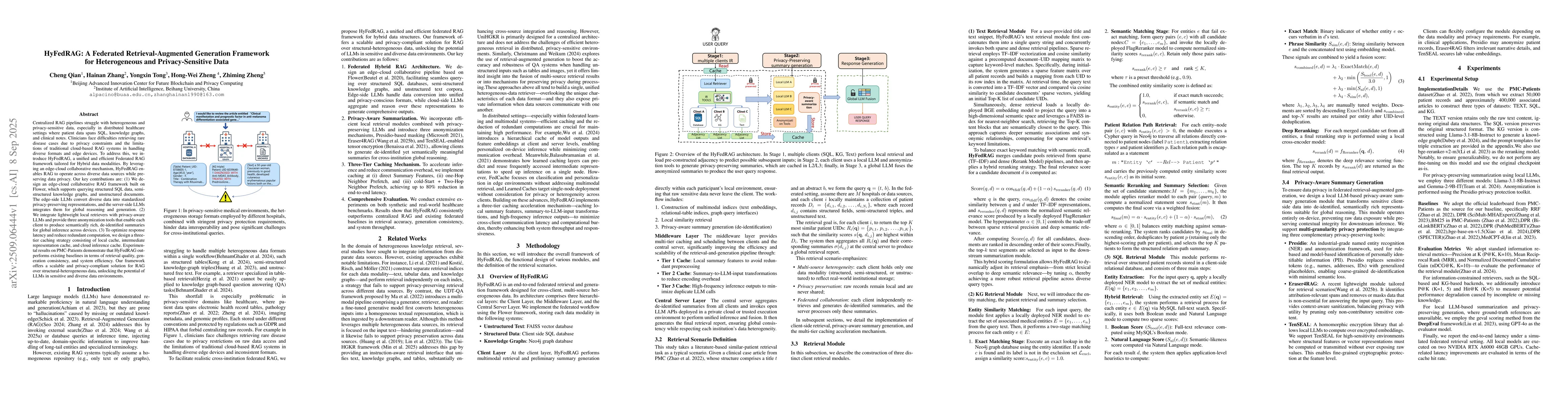 Centralized RAG pipelines struggle with heterogeneous and privacy-sensitive data, especially in distributed healthcare settings where patient data spans SQL, knowledge graphs, and clinical notes. Clinicians face difficulties retrieving rare disease cases due to privacy constraints and the limitations of traditional cloud-based RAG systems in handling diverse formats and edge devices. To address this, we introduce HyFedRAG, a unified and efficient Federated RAG framework tailored for Hybrid data modalities. By leveraging an edge-cloud collaborative mechanism, HyFedRAG enables RAG to operate across diverse data sources while preserving data privacy. Our key contributions are: (1) We design an edge-cloud collaborative RAG framework built on Flower, which supports querying structured SQL data, semi-structured knowledge graphs, and unstructured documents. The edge-side LLMs convert diverse data into standardized privacy-preserving representations, and the server-side LLMs integrates them for global reasoning and generation. (2) We integrate lightweight local retrievers with privacy-aware LLMs and provide three anonymization tools that enable each client to produce semantically rich, de-identified summaries for global inference across devices. (3) To optimize response latency and reduce redundant computation, we design a three-tier caching strategy consisting of local cache, intermediate representation cache, and cloud inference cache. Experimental results on PMC-Patients demonstrate that HyFedRAG outperforms existing baselines in terms of retrieval quality, generation consistency, and system efficiency. Our framework offers a scalable and privacy-compliant solution for RAG over structural-heterogeneous data, unlocking the potential of LLMs in sensitive and diverse data environments.