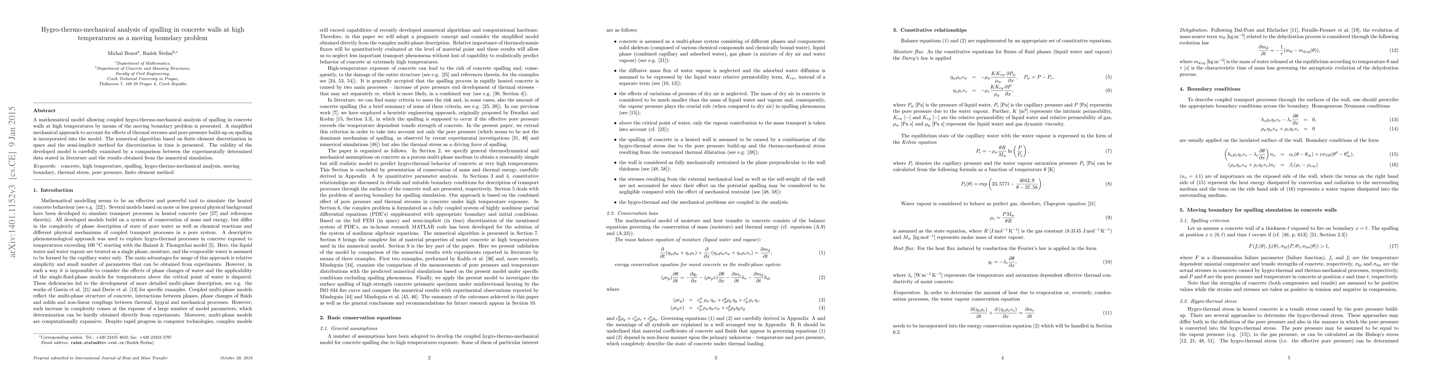 This paper presents a mathematical model for the coupled hygro-thermo-mechanical analysis of spalling in concrete walls at high temperatures, framed as a moving boundary problem. The model incorporates thermal stresses and pore pressure effects, validated through comparison with experimental data from previous studies.