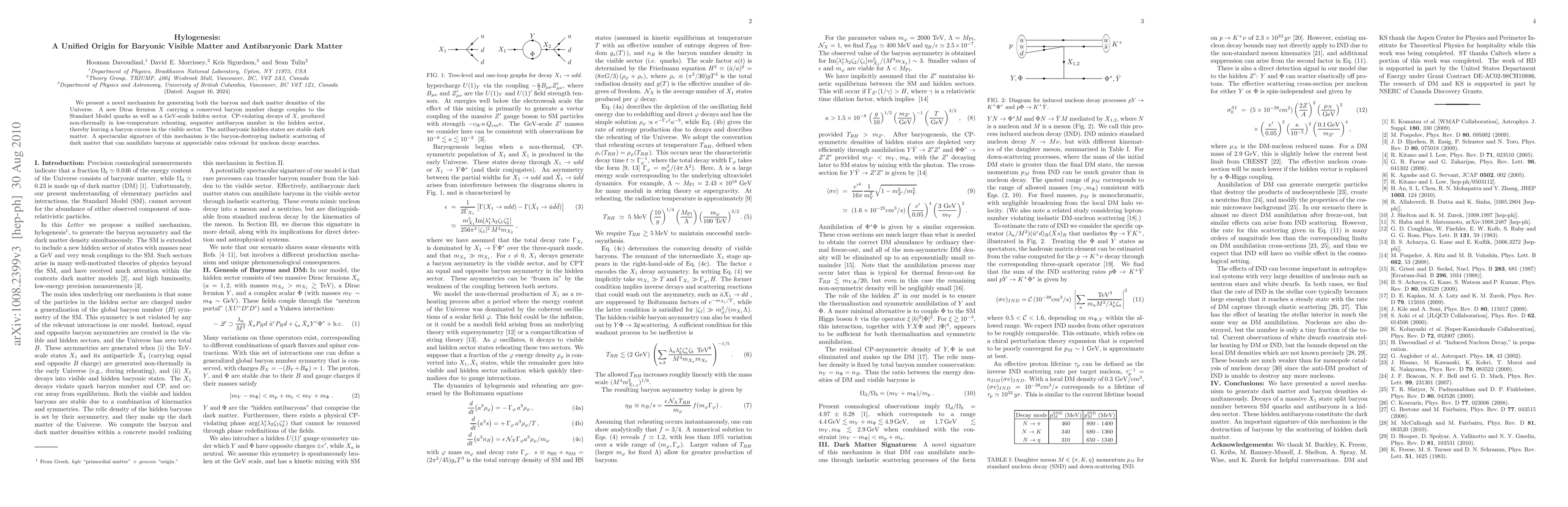 We present a novel mechanism for generating both the baryon and dark matter densities of the Universe. A new Dirac fermion X carrying a conserved baryon number charge couples to the Standard Model quarks as well as a GeV-scale hidden sector. CP-violating decays of X, produced non-thermally in low-temperature reheating, sequester antibaryon number in the hidden sector, thereby leaving a baryon excess in the visible sector. The antibaryonic hidden states are stable dark matter. A spectacular signature of this mechanism is the baryon-destroying inelastic scattering of dark matter that can annihilate baryons at appreciable rates relevant for nucleon decay searches.