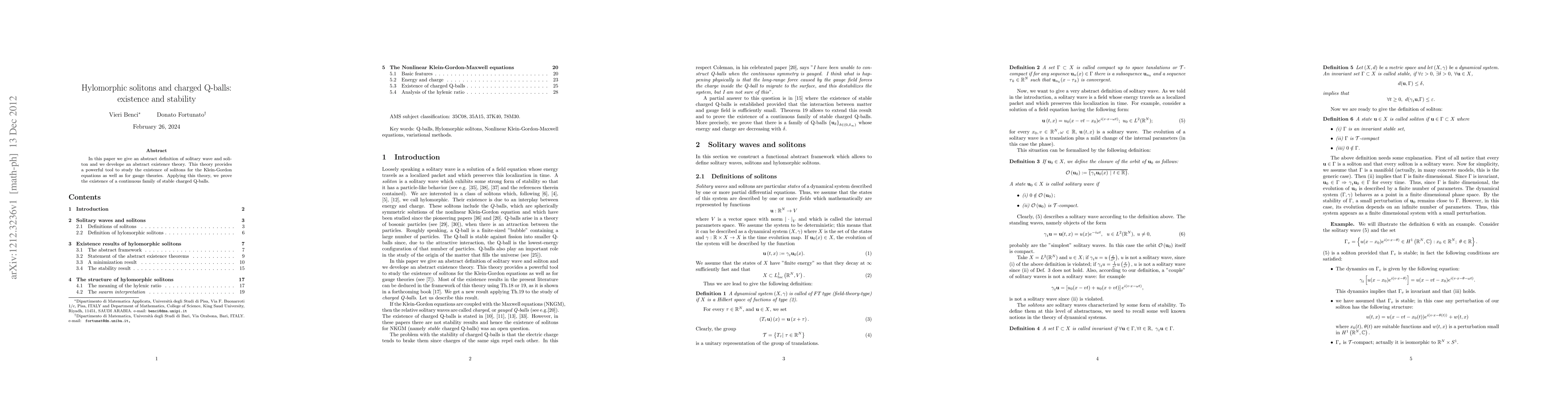 In this paper we give an abstract definition of solitary wave and soliton and we develop an abstract existence theory. This theory provides a powerful tool to study the existence of solitons for the Klein-Gordon equations as well as for gauge theories. Applying this theory, we prove the existence of a continuous family of stable charged Q-balls.