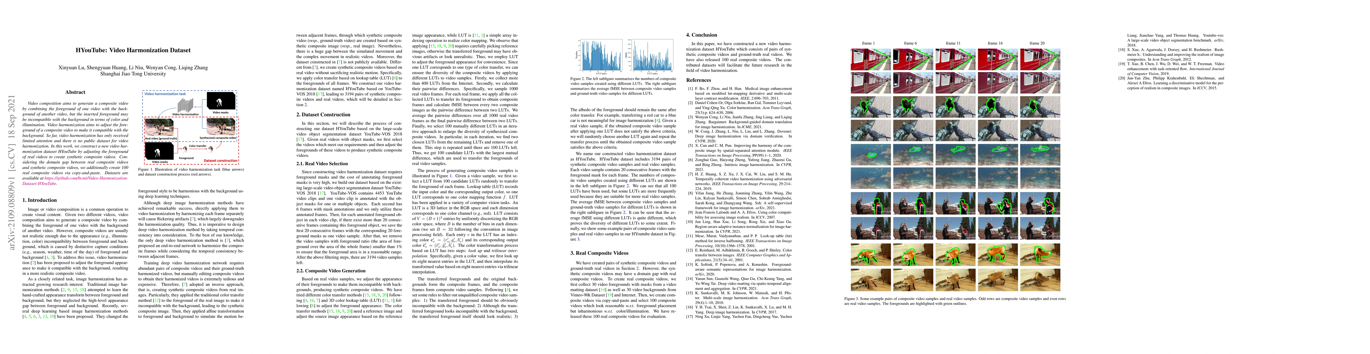 This paper introduces HYouTube, a new video harmonization dataset for training models to adjust foregrounds to match backgrounds in composite videos. The dataset includes both synthetic and real composite videos to bridge the domain gap, and is available for public use.