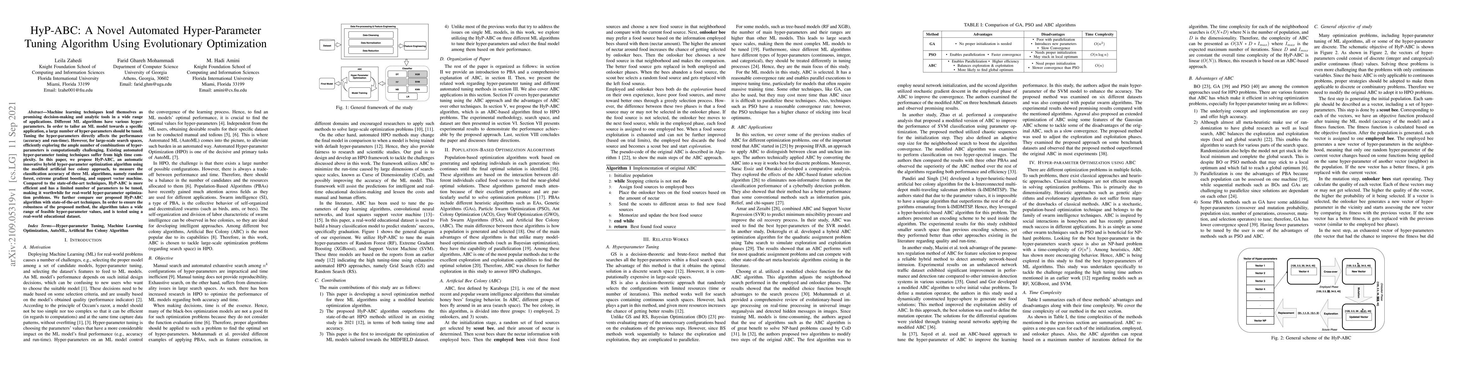 HyP-ABC is a novel automated hyper-parameter tuning algorithm using evolutionary optimization, specifically a modified artificial bee colony approach, to efficiently tune hyper-parameters for machine learning models. The algorithm demonstrates superior efficiency compared to existing methods and is validated using real-world educational data.