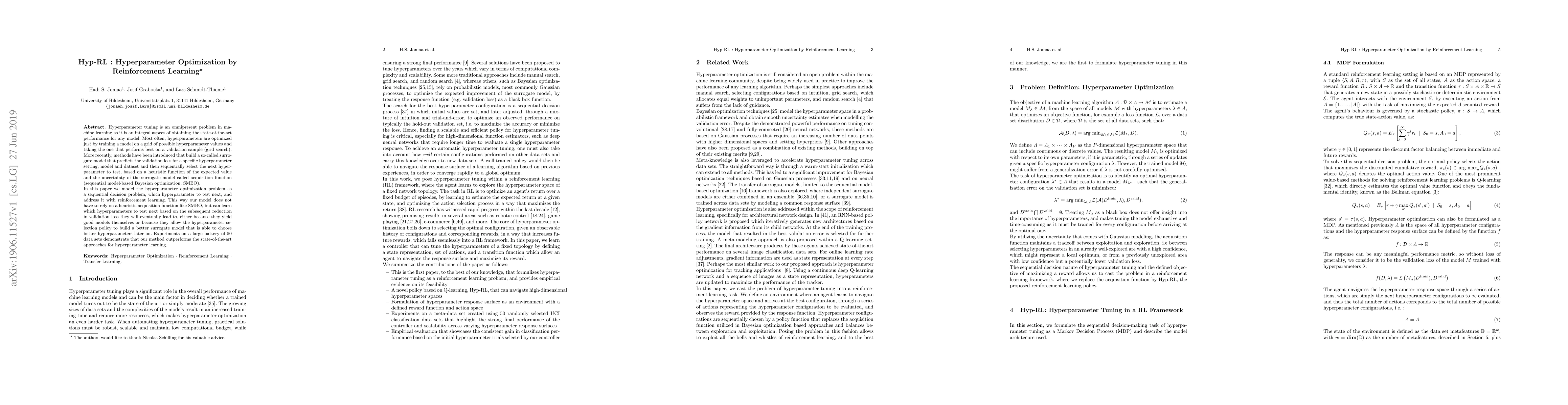 This paper proposes Hyp-RL, a reinforcement learning approach for hyperparameter optimization that models the problem as a sequential decision process. Unlike traditional methods, it learns the best hyperparameters to test next based on validation loss reduction, outperforming state-of-the-art methods on a diverse set of 50 datasets.