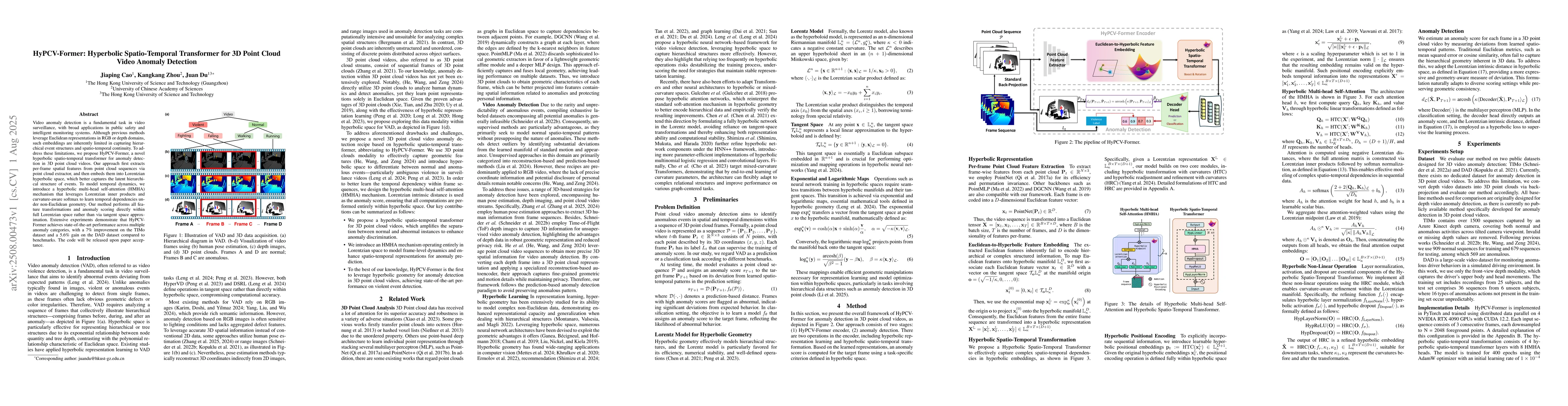 Video anomaly detection is a fundamental task in video surveillance, with broad applications in public safety and intelligent monitoring systems. Although previous methods leverage Euclidean representations in RGB or depth domains, such embeddings are inherently limited in capturing hierarchical event structures and spatio-temporal continuity. To address these limitations, we propose HyPCV-Former, a novel hyperbolic spatio-temporal transformer for anomaly detection in 3D point cloud videos. Our approach first extracts per-frame spatial features from point cloud sequences via point cloud extractor, and then embeds them into Lorentzian hyperbolic space, which better captures the latent hierarchical structure of events. To model temporal dynamics, we introduce a hyperbolic multi-head self-attention (HMHA) mechanism that leverages Lorentzian inner products and curvature-aware softmax to learn temporal dependencies under non-Euclidean geometry. Our method performs all feature transformations and anomaly scoring directly within full Lorentzian space rather than via tangent space approximation. Extensive experiments demonstrate that HyPCV-Former achieves state-of-the-art performance across multiple anomaly categories, with a 7\% improvement on the TIMo dataset and a 5.6\% gain on the DAD dataset compared to benchmarks. The code will be released upon paper acceptance.