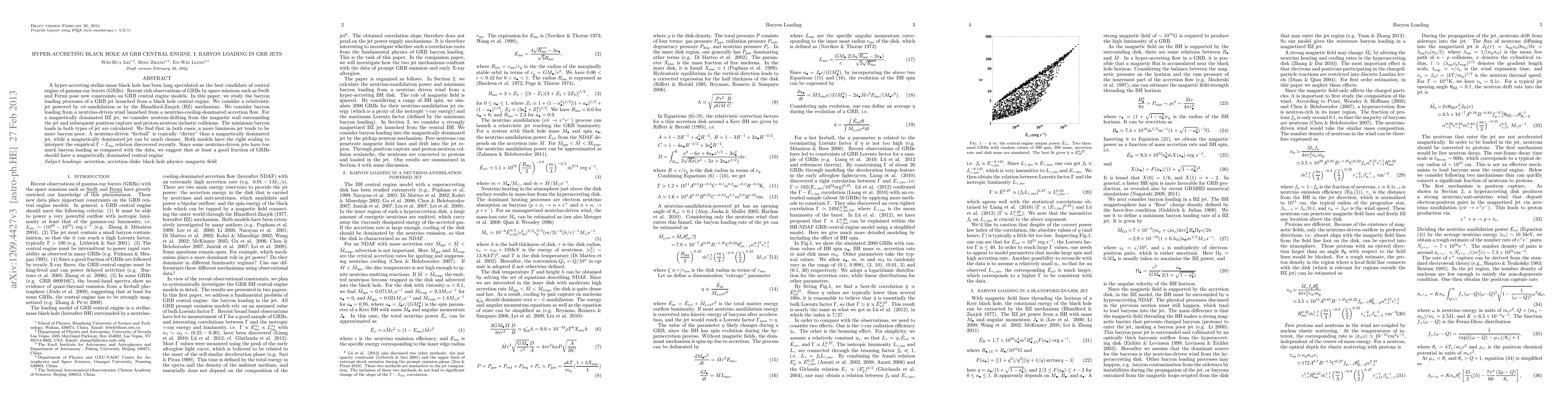 A hyper-accreting stellar-mass black hole has been long speculated as the best candidate of central engine of gamma-ray bursts (GRBs). Recent rich observations of GRBs by space missions such as Swift and Fermi pose new constraints on GRB central engine models. In this paper, we study the baryon loading processes of a GRB jet launched from a black hole central engine. We consider a relativistic jet powered by $\nu \bar\nu$-annihilation or by the Blandford-Znajek (BZ) mechanism. We consider baryon loading from a neutrino-driven wind from a neutrino-cooling-dominated accretion flow. For a magnetically dominated BZ jet, we consider neutron-drifting from the magnetic wall surrounding the jet and subsequent positron capture and proton-neutron inelastic collisions. The minumim baryon loads in both types of jet are calculated. We find that in both cases, a more luminous jet tends to be more baryon poor. A neutrino-driven "fireball" is typically "dirtier" than a magnetically dominated jet, while a magnetically dominated jet can be much cleaner. Both models have the right scaling to interpret the empirical $\Gamma-L_{\rm iso}$ relation discovered recently. Since some neutrino-driven jets have too much baryon loading as compared with the data, we suggest that at least a good fraction of GRBs should have a magnetically dominated central engine.