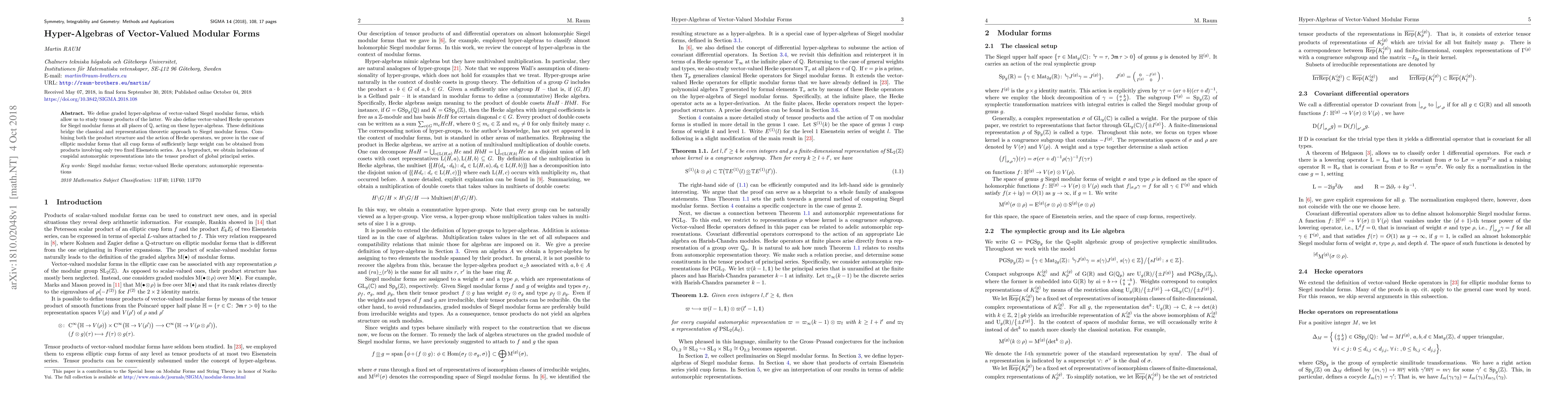 This paper introduces graded hyper-algebras of vector-valued Siegel modular forms and vector-valued Hecke operators, bridging classical and representation-theoretic approaches. It proves that for elliptic modular forms, cusp forms of sufficiently large weight can be generated from products involving two fixed Eisenstein series.