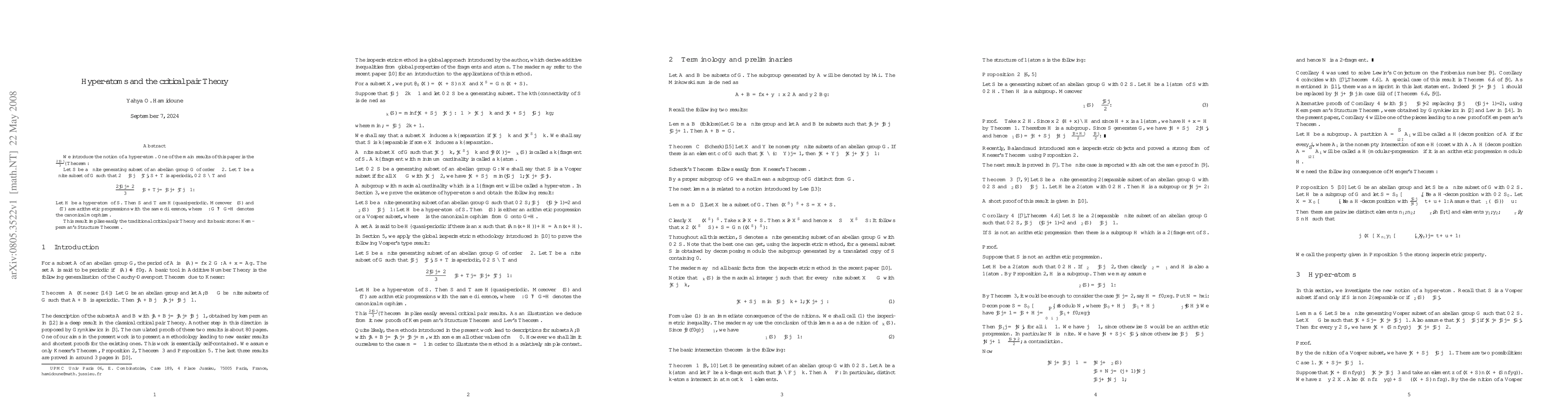 We introduce the notion of a hyper-atom. One of the main results of this paper is the $\frac{2|G|}3$--Theorem: Let $S$ be a finite generating subset of an abelian group $G$ of order $\ge 2$. Let $T$ be a finite subset of $G$ such that $2\le |S|\le |T|$, $S+T$ is aperiodic, $0\in S\cap T$ and $$ \frac{2|G|+2}3\ge |S+T|= |S|+|T|-1.$$ Let $H$ be a hyper-atom of $S$. Then $S$ and $T$ are $H$--quasi-periodic. Moreover $\phi(S)$ and $\phi(T)$ are arithmetic progressions with the same difference, where $\phi :G\mapsto G/H$ denotes the canonical morphism. This result implies easily the traditional critical pair Theory and its basic stone: Kemperman's Structure Theorem.