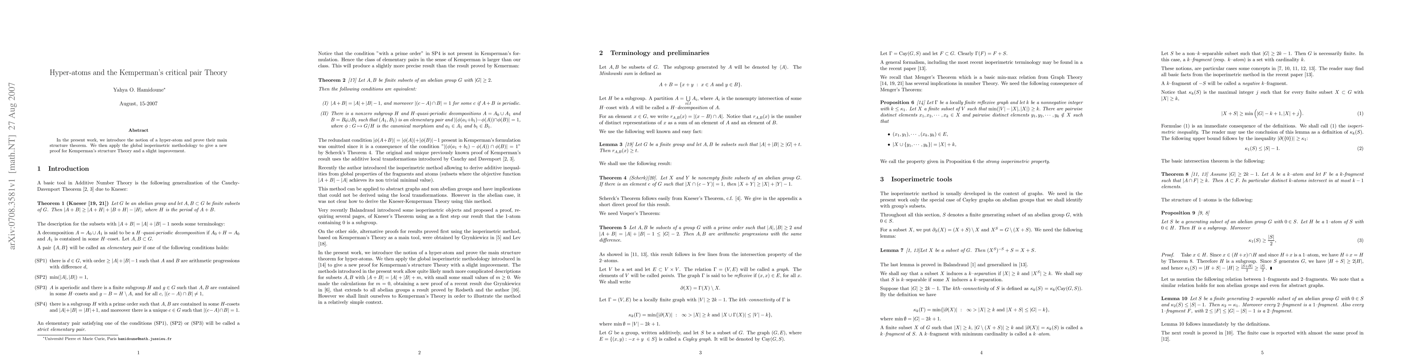 In the present work, we introduce the notion of a hyper-atom and prove their main structure theorem. We then apply the global isoperimetric methodology to give a new proof for Kemperman's structure Theory and a slight improvement.