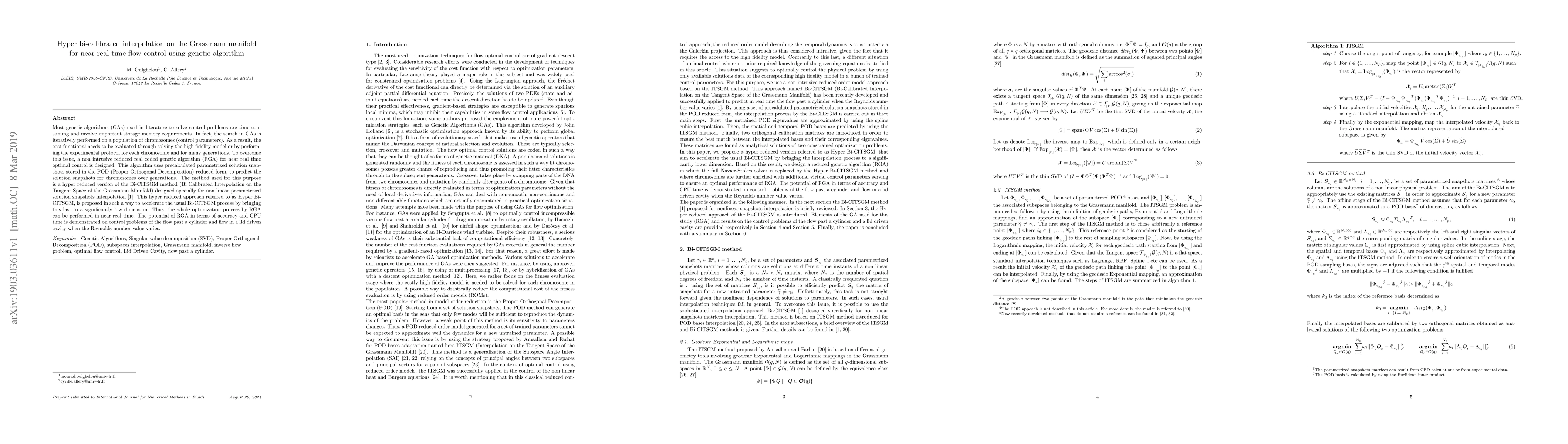 This paper proposes a hyper bi-calibrated interpolation method on the Grassmann manifold to accelerate genetic algorithms for near real-time flow control. The method uses precalculated solution snapshots in reduced form to predict new solutions, significantly speeding up the usual calibration process and enabling near real-time optimization.