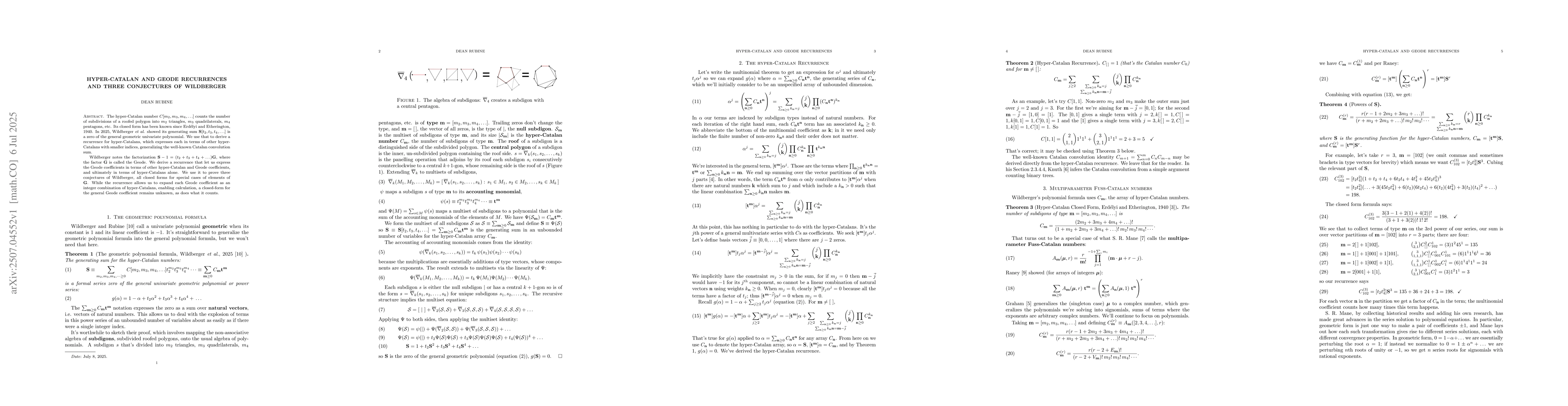 The hyper-Catalan number $C[m_2,m_3,m_4,\ldots]$ counts the number of subdivisions of a roofed polygon into $m_2$ triangles, $m_3$ quadrilaterals, $m_4$ pentagons, etc. Its closed form has been known since Erd\'elyi and Etherington, 1940. In 2025, Wildberger and Rubine showed its generating sum $\mathbf{S}[t_2,t_3,t_4,\ldots]$ is a zero of the general geometric univariate polynomial. We use that to derive a recurrence for hyper-Catalans, which expresses each in terms of other hyper-Catalans with smaller indices, generalizing the well-known Catalan convolution sum. Wildberger notes the factorization $\mathbf{S}-1=(t_2 + t_3 + t_4 + \ldots)\mathbf{G}$, where the factor $\mathbf{G}$ is called the Geode. We derive a recurrence that let us express the Geode coefficients in terms of other hyper-Catalan and Geode coefficients, and ultimately in terms of hyper-Catalans alone. We use it to prove three conjectures of Wildberger, all closed forms for special cases of elements of $\mathbf{G}$. While the recurrence allows us to expand each Geode coefficient as an integer combination of hyper-Catalans, enabling calculation, a closed-form for the general Geode coefficient remains unknown, as does what it counts.