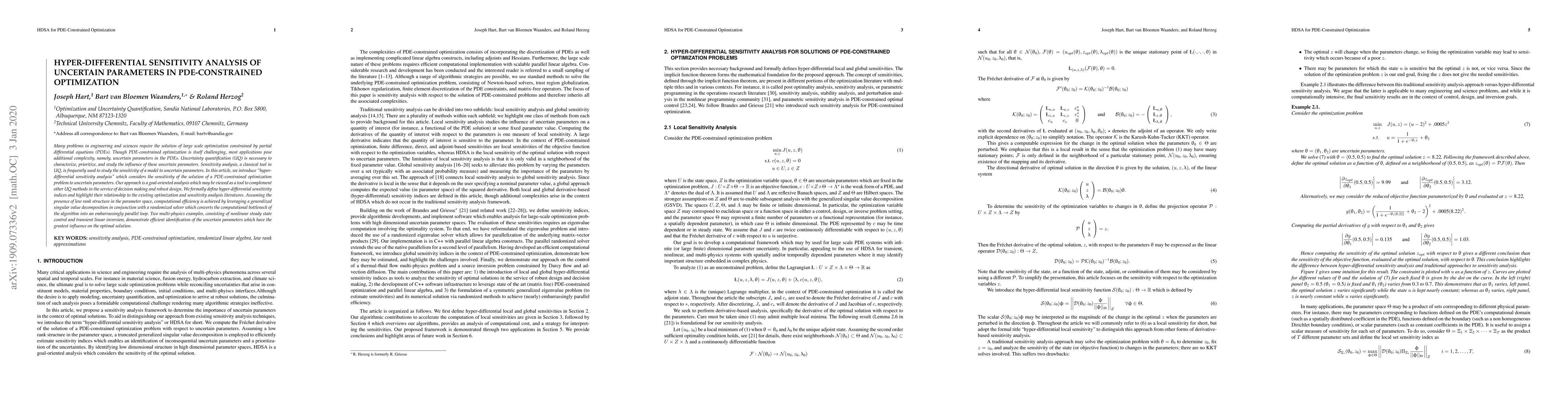 This paper introduces "hyper-differential sensitivity analysis" to assess the impact of uncertain parameters in PDE-constrained optimization problems, providing efficient identification of influential parameters through a randomized solver and generalized singular value decomposition. It demonstrates the method’s effectiveness with two multi-physics examples.