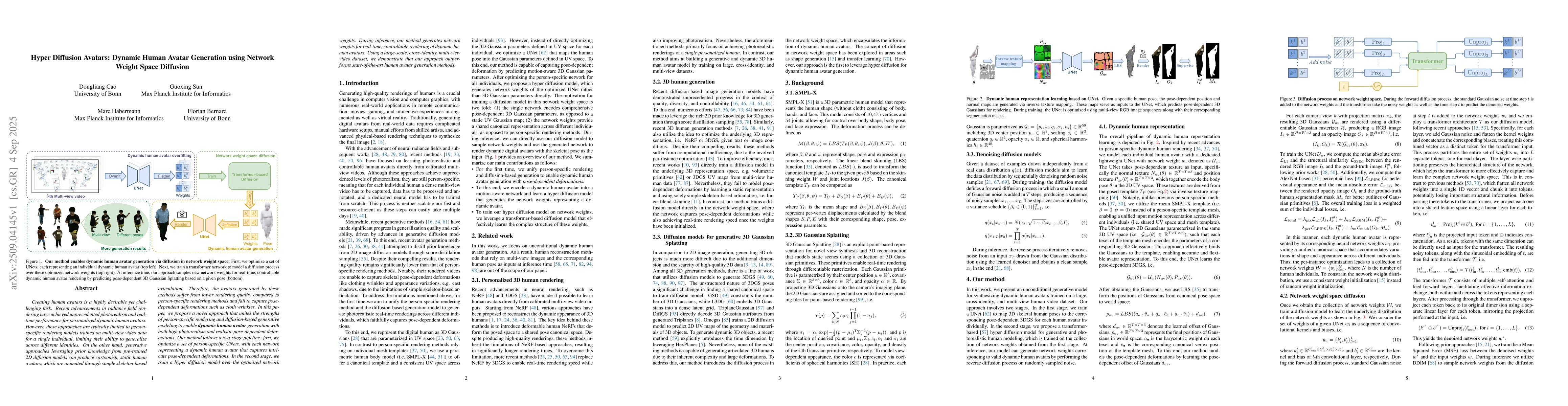 Creating human avatars is a highly desirable yet challenging task. Recent advancements in radiance field rendering have achieved unprecedented photorealism and real-time performance for personalized dynamic human avatars. However, these approaches are typically limited to person-specific rendering models trained on multi-view video data for a single individual, limiting their ability to generalize across different identities. On the other hand, generative approaches leveraging prior knowledge from pre-trained 2D diffusion models can produce cartoonish, static human avatars, which are animated through simple skeleton-based articulation. Therefore, the avatars generated by these methods suffer from lower rendering quality compared to person-specific rendering methods and fail to capture pose-dependent deformations such as cloth wrinkles. In this paper, we propose a novel approach that unites the strengths of person-specific rendering and diffusion-based generative modeling to enable dynamic human avatar generation with both high photorealism and realistic pose-dependent deformations. Our method follows a two-stage pipeline: first, we optimize a set of person-specific UNets, with each network representing a dynamic human avatar that captures intricate pose-dependent deformations. In the second stage, we train a hyper diffusion model over the optimized network weights. During inference, our method generates network weights for real-time, controllable rendering of dynamic human avatars. Using a large-scale, cross-identity, multi-view video dataset, we demonstrate that our approach outperforms state-of-the-art human avatar generation methods.