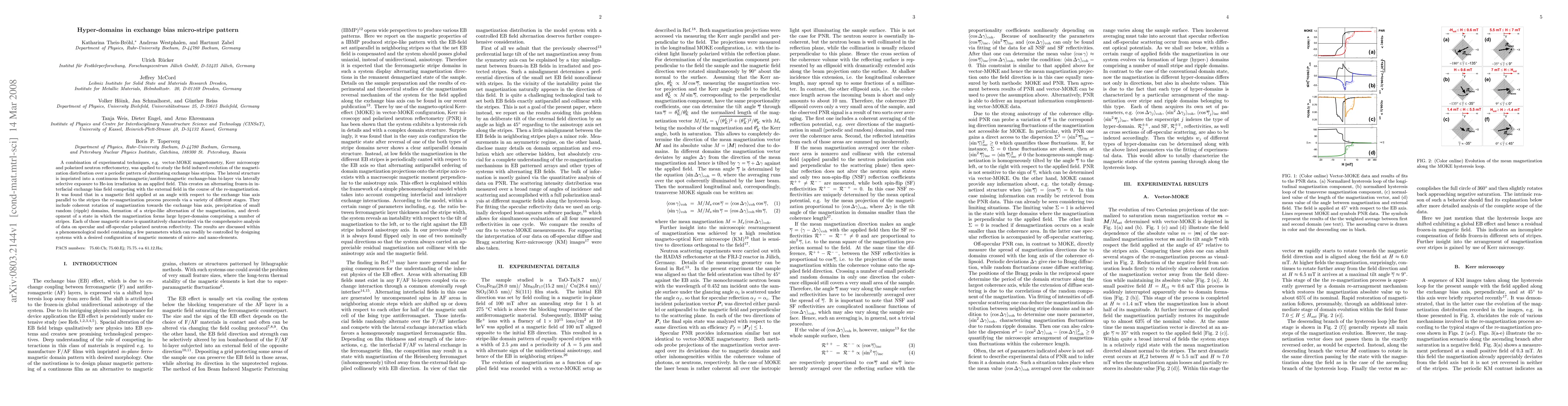 A combination of experimental techniques, e.g. vector-MOKE magnetometry, Kerr microscopy and polarized neutron reflectometry, was applied to study the field induced evolution of the magnetization distribution over a periodic pattern of alternating exchange bias stripes. The lateral structure is imprinted into a continuous ferromagnetic/antiferromagnetic exchange-bias bi-layer via laterally selective exposure to He-ion irradiation in an applied field. This creates an alternating frozen-in interfacial exchange bias field competing with the external field in the course of the re-magnetization. It was found that in a magnetic field applied at an angle with respect to the exchange bias axis parallel to the stripes the re-magnetization process proceeds via a variety of different stages. They include coherent rotation of magnetization towards the exchange bias axis, precipitation of small random (ripple) domains, formation of a stripe-like alternation of the magnetization, and development of a state in which the magnetization forms large hyper-domains comprising a number of stripes. Each of those magnetic states is quantitatively characterized via the comprehensive analysis of data on specular and off-specular polarized neutron reflectivity. The results are discussed within a phenomenological model containing a few parameters which can readily be controlled by designing systems with a desired configuration of magnetic moments of micro- and nano-elements.