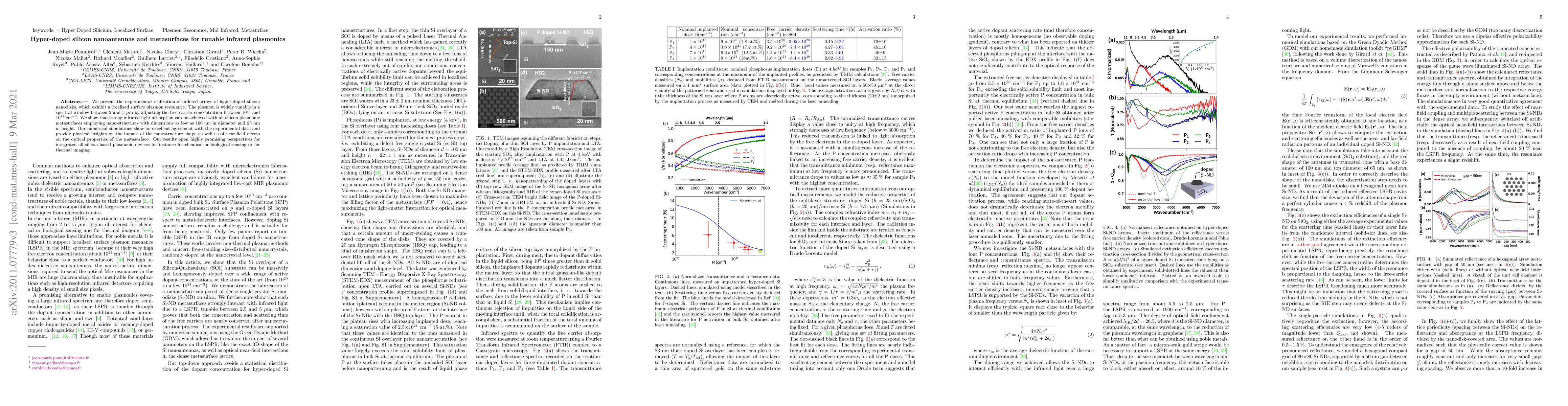 We present the experimental realization of ordered arrays of hyper-doped silicon nanodisks, which exhibit a localized surface plasmon resonance. The plasmon is widely tunable in a spectral window between 2 and 5 $\mu$m by adjusting the free carrier concentration between 10$^{20}$ and 10$^{21}$ cm$^{-3}$. We show that strong infrared light absorption can be achieved with all-silicon plasmonic metasurfaces employing nano-structures with dimensions as low as 100\,nm in diameter and 23 nm in height. Our numerical simulations show an excellent agreement with the experimental data and provide physical insights on the impact of the nanostructure shape as well as of near-field effects on the optical properties of the metasurface. Our results open highly promising perspectives for integrated all-silicon-based plasmonic devices for instance for chemical or biological sensing or for thermal imaging.