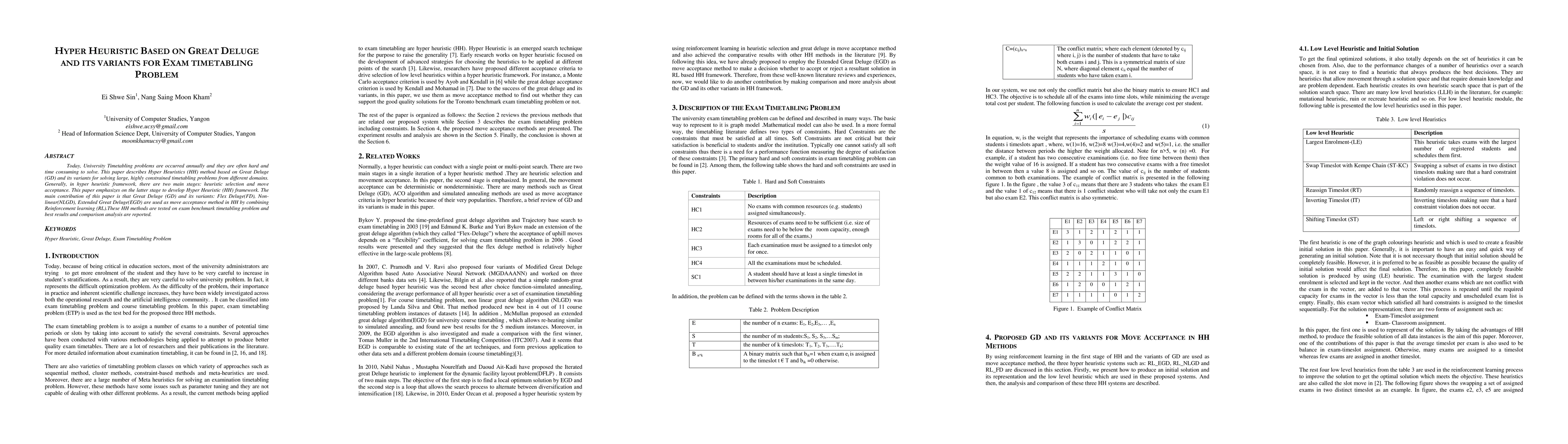 This paper proposes a hyper heuristic approach using Great Deluge variants to solve large timetabling problems, achieving better results with reinforcement learning, and demonstrating its effectiveness on an exam benchmark problem.