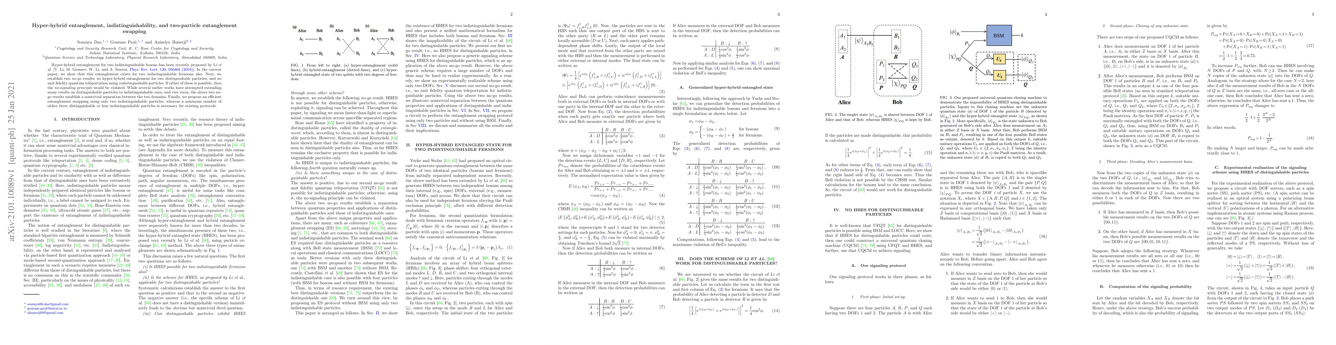 Hyper-hybrid entanglement for two indistinguishable bosons has been recently proposed by Li \textit{et al.} [Y. Li, M. Gessner, W. Li, and A. Smerzi, \href{https://doi.org/10.1103/PhysRevLett.120.050404}{Phys. Rev. Lett. 120, 050404 (2018)}]. In the current paper, we show that this entanglement exists for two indistinguishable fermions also. Next, we establish two {\em no-go} results: no hyper-hybrid entanglement for two {\em distinguishable} particles, and no unit fidelity quantum teleportation using {\em indistinguishable} particles. If either of these is possible, then the {\em no-signaling principle} would be violated. While several earlier works have attempted extending many results on distinguishable particles to indistinguishable ones, and vice versa, the above two no-go results establish a nontrivial separation between the two domains. Finally, we propose an efficient entanglement swapping using only two indistinguishable particles, whereas a minimum number of either three distinguishable or four indistinguishable particles is necessary for existing protocols.