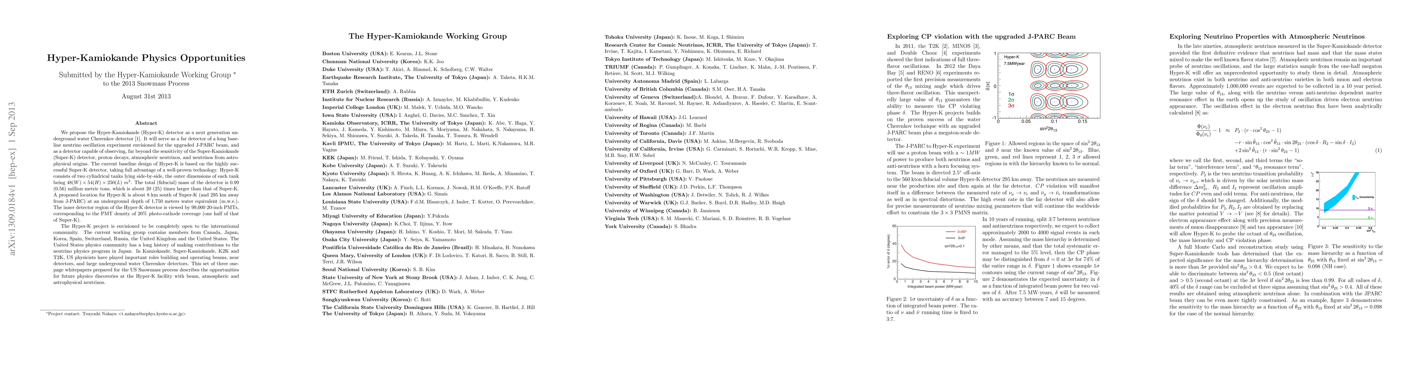 We propose the Hyper-Kamiokande (Hyper-K) detector as a next generation un- derground water Cherenkov detector. It will serve as a far detector of a long base- line neutrino oscillation experiment envisioned for the upgraded J-PARC beam, and as a detector capable of observing, far beyond the sensitivity of the Super-Kamiokande (Super-K) detector, proton decays, atmospheric neutrinos, and neutrinos from astro- physical origins. The current baseline design of Hyper-K is based on the highly suc- cessful Super-K detector, taking full advantage of a well-proven technology. Hyper-K consists of two cylindrical tanks lying side-by-side, the outer dimensions of each tank being 48(W) x54(H) x 250(L) m3. The total (fiducial) mass of the detector is 0.99 (0.56) million metric tons, which is about 20 (25) times larger than that of Super-K. This set of three one- page whitepapers prepared for the US Snowmass process describes the opportunities for future physics discoveries at the Hyper-K facility with beam, atmospheric and astrophysical neutrinos.