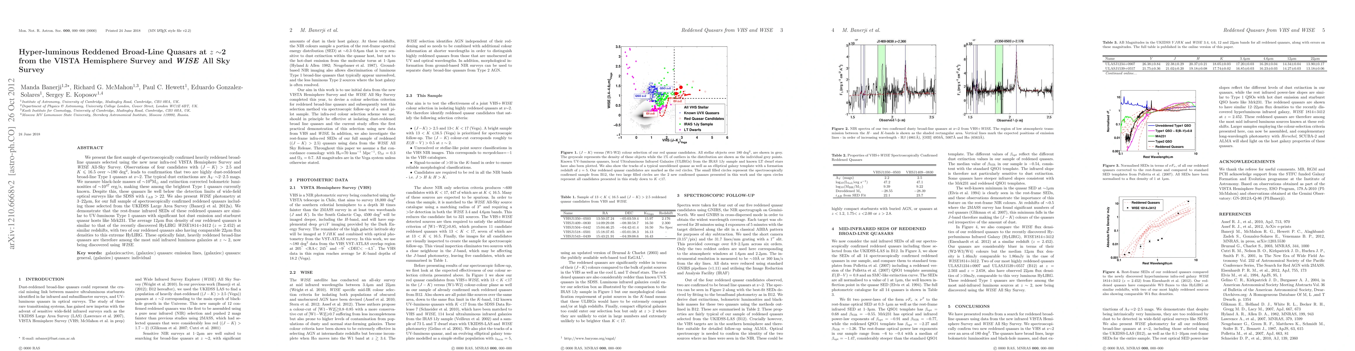 This paper identifies and confirms two heavily reddened broad-line quasars at z~2 using the VISTA Hemisphere and WISE All-Sky Surveys, revealing their high dust extinctions and extreme infrared luminosities, comparable to hyper-luminous infrared galaxies. These quasars are among the brightest known despite being undetectable in optical surveys.