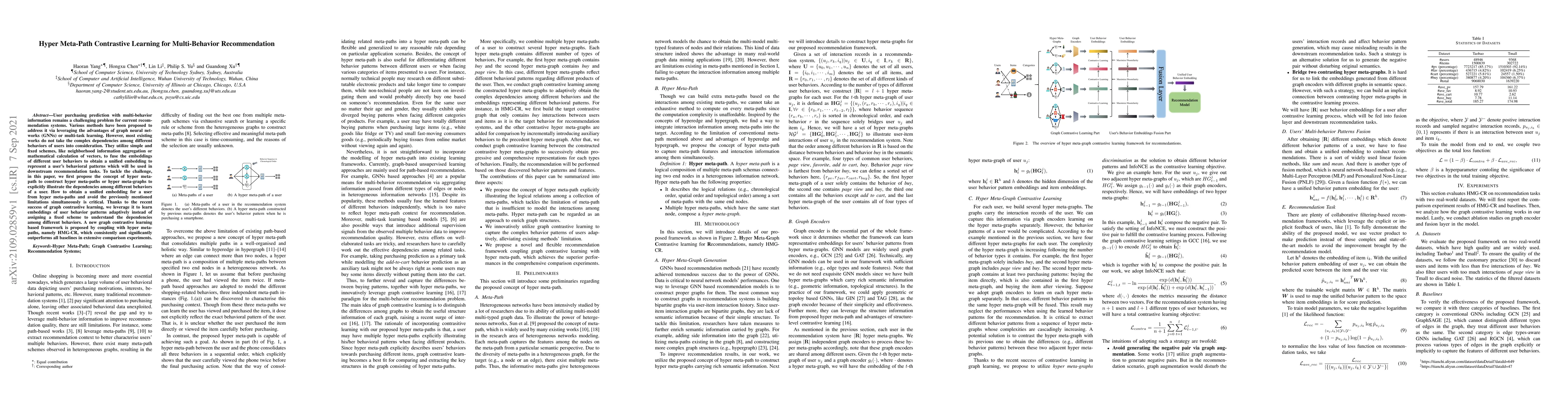 This paper proposes a novel hyper meta-path contrastive learning framework, HMG-CR, to address the challenge of user purchasing prediction using multi-behavior information. It leverages graph contrastive learning to adaptively learn user behavior embeddings, overcoming limitations of existing methods that rely on fixed schemes.