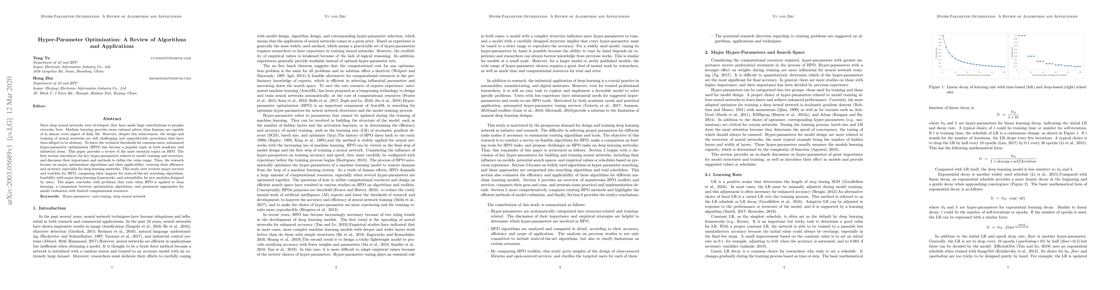 Since deep neural networks were developed, they have made huge contributions to everyday lives. Machine learning provides more rational advice than humans are capable of in almost every aspect of daily life. However, despite this achievement, the design and training of neural networks are still challenging and unpredictable procedures. To lower the technical thresholds for common users, automated hyper-parameter optimization (HPO) has become a popular topic in both academic and industrial areas. This paper provides a review of the most essential topics on HPO. The first section introduces the key hyper-parameters related to model training and structure, and discusses their importance and methods to define the value range. Then, the research focuses on major optimization algorithms and their applicability, covering their efficiency and accuracy especially for deep learning networks. This study next reviews major services and toolkits for HPO, comparing their support for state-of-the-art searching algorithms, feasibility with major deep learning frameworks, and extensibility for new modules designed by users. The paper concludes with problems that exist when HPO is applied to deep learning, a comparison between optimization algorithms, and prominent approaches for model evaluation with limited computational resources.
