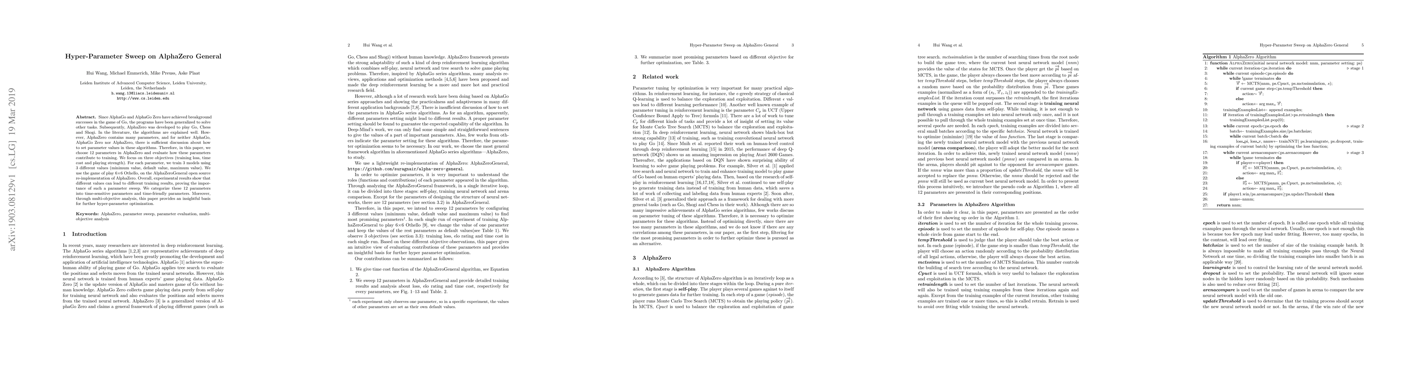This paper conducts a hyper-parameter sweep on AlphaZero General, focusing on 12 parameters to evaluate their impact on training loss, time cost, and playing strength in the 6x6 Othello game. Results highlight the importance of parameter tuning and categorize parameters into time-sensitive and time-friendly groups, offering a foundation for future optimization.