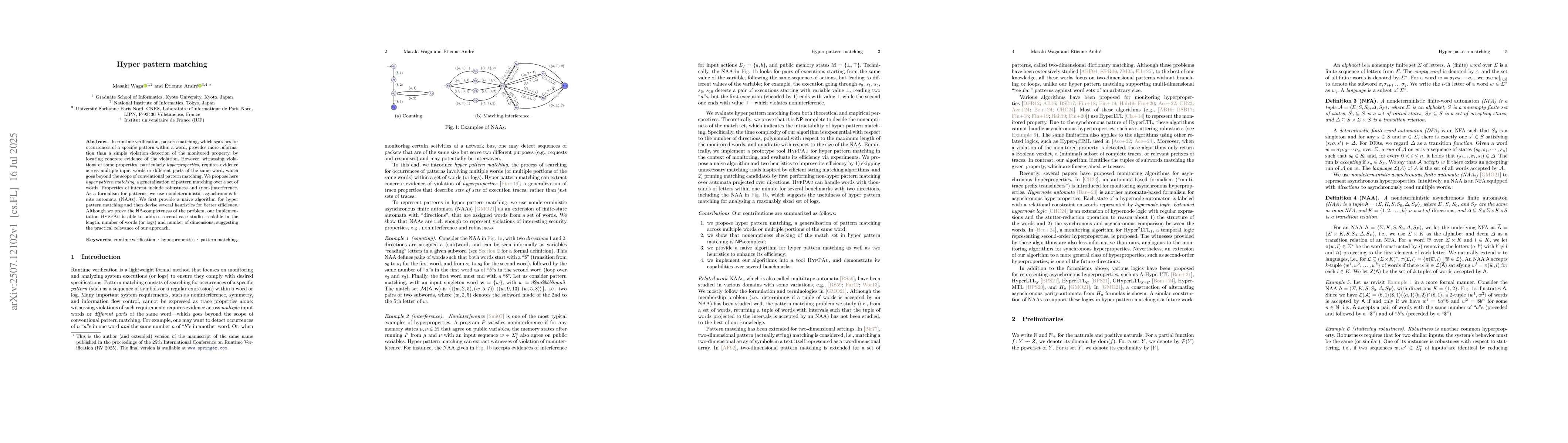 In runtime verification, pattern matching, which searches for occurrences of a specific pattern within a word, provides more information than a simple violation detection of the monitored property, by locating concrete evidence of the violation. However, witnessing violations of some properties, particularly hyperproperties, requires evidence across multiple input words or different parts of the same word, which goes beyond the scope of conventional pattern matching. We propose here hyper pattern matching, a generalization of pattern matching over a set of words. Properties of interest include robustness and (non-)interference. As a formalism for patterns, we use nondeterministic asynchronous finite automata (NAAs). We first provide a naive algorithm for hyper pattern matching and then devise several heuristics for better efficiency. Although we prove the NP-completeness of the problem, our implementation HypPAu is able to address several case studies scalable in the length, number of words (or logs) and number of dimensions, suggesting the practical relevance of our approach.