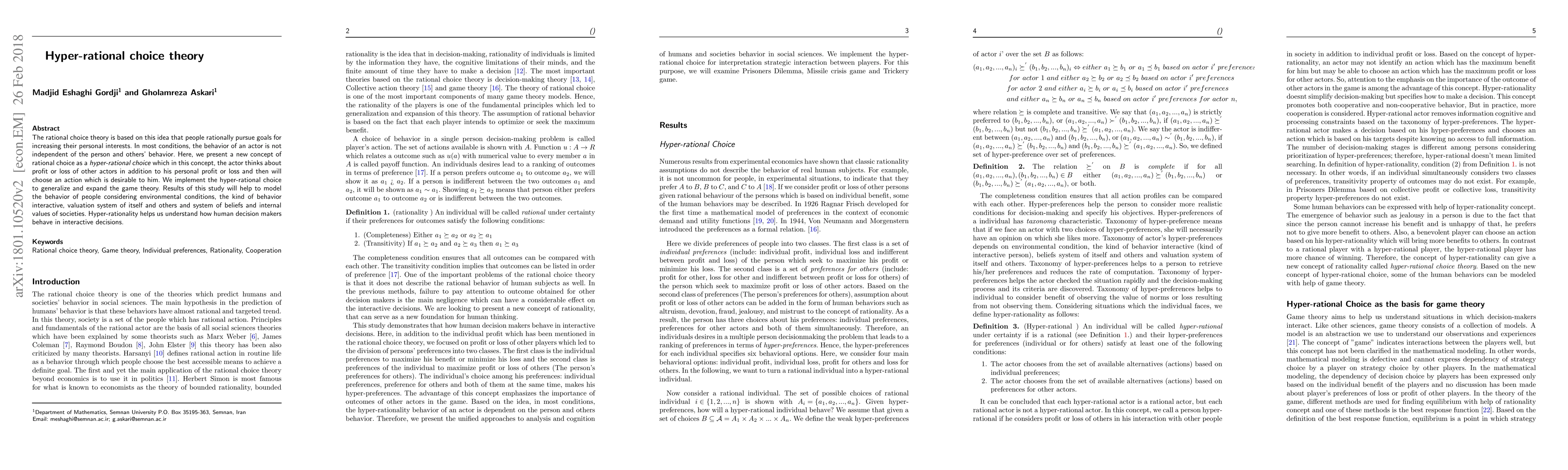 This study introduces hyper-rational choice theory, which considers the profit or loss of others in addition to personal gain when making decisions. It aims to expand game theory and model human behavior in interactive situations.