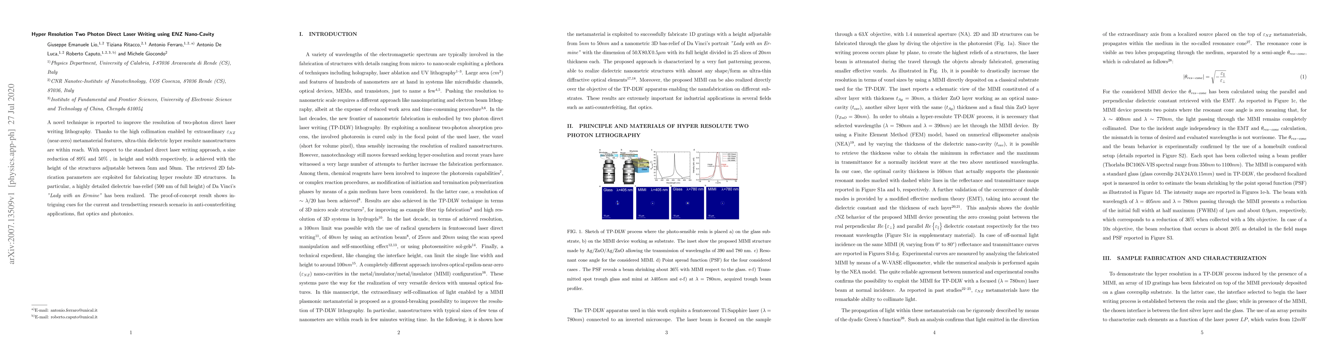 A novel technique is reported to improve the resolution of two-photon direct laser writing lithography. Thanks to the high collimation enabled by extraordinary $\varepsilon_{NZ}$ (near-zero) metamaterial features, ultra-thin dielectric hyper resolute nanostructures are within reach. With respect to the standard direct laser writing approach, a size reduction of $89\%$ and $50\%$ , in height and width respectively, is achieved with the height of the structures adjustable between 5nm and 50nm. The retrieved 2D fabrication parameters are exploited for fabricating hyper resolute 3D structures. In particular, a highly detailed dielectric bas-relief (500 nm of full height) of Da Vinci's \textit{"Lady with an Ermine"} has been realized. The proof-of-concept result shows intriguing cues for the current and trendsetting research scenario in anti-counterfeiting applications, flat optics and photonics.