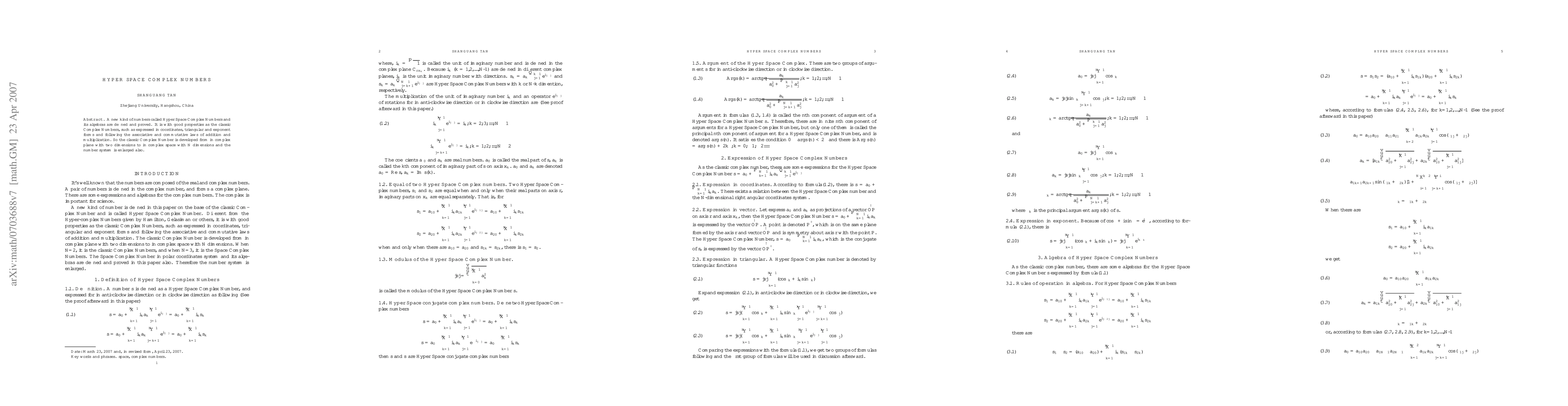 A new kind of numbers called Hyper Space Complex Numbers and its algebras are defined and proved. It is with good properties as the classic Complex Numbers, such as expressed in coordinates, triangular and exponent forms and following the associative and commutative laws of addition and multiplication. So the classic Complex Number is developed from in complex plane with two dimensions to in complex space with N dimensions and the number system is enlarged also.