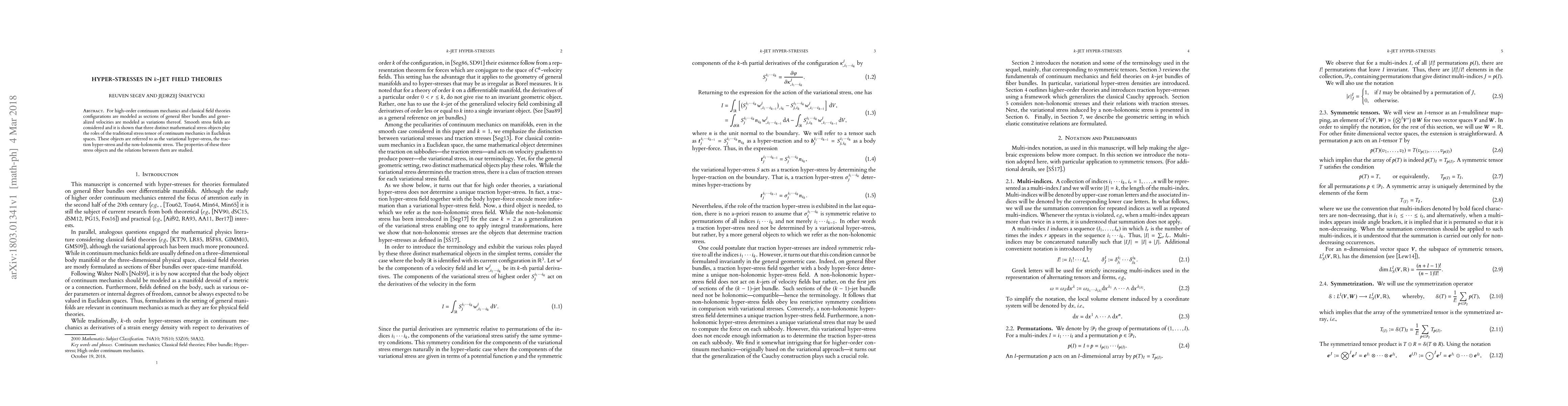 For high-order continuum mechanics and classical field theories configurations are modeled as sections of general fiber bundles and generalized velocities are modeled as variations thereof. Smooth stress fields are considered and it is shown that three distinct mathematical stress objects play the roles of the traditional stress tensor of continuum mechanics in Euclidean spaces. These objects are referred to as the variational hyper-stress, the traction hyper-stress and the non-holonomic stress. The properties of these three stress objects and the relations between them are studied.