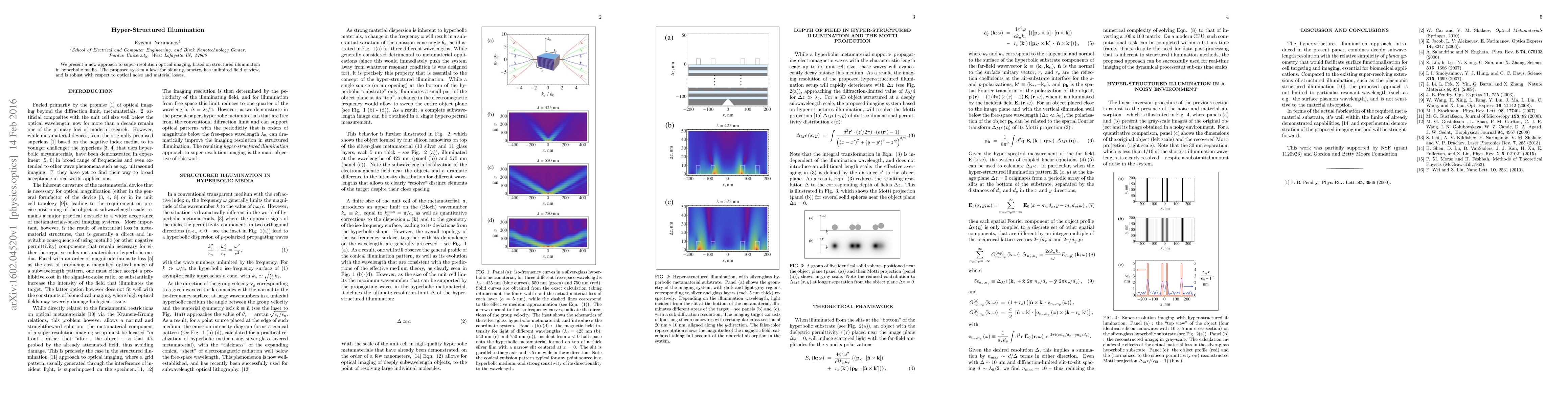 We present a new approach to super-resolution optical imaging, based on structured illumination in hyperbolic media. The proposed system allows for planar geometry, has unlimited field of view, and is robust with respect to optical noise and material losses.