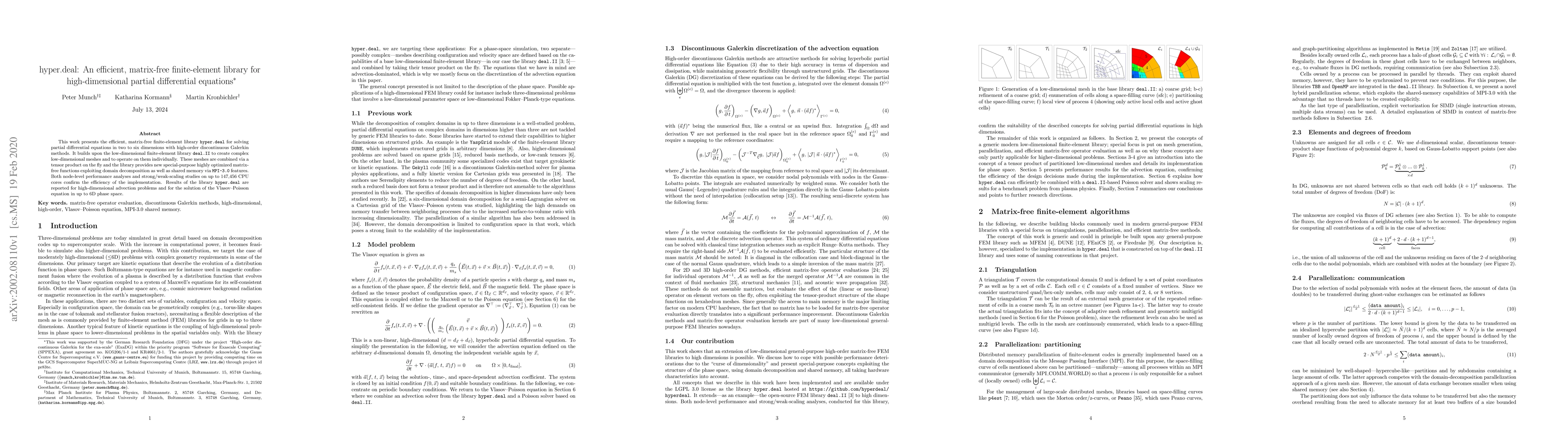 The paper introduces hyper.deal, a matrix-free finite-element library for high-dimensional PDEs using high-order discontinuous Galerkin methods. It efficiently combines low-dimensional meshes via tensor products and optimizes performance using domain decomposition and MPI-3.0.