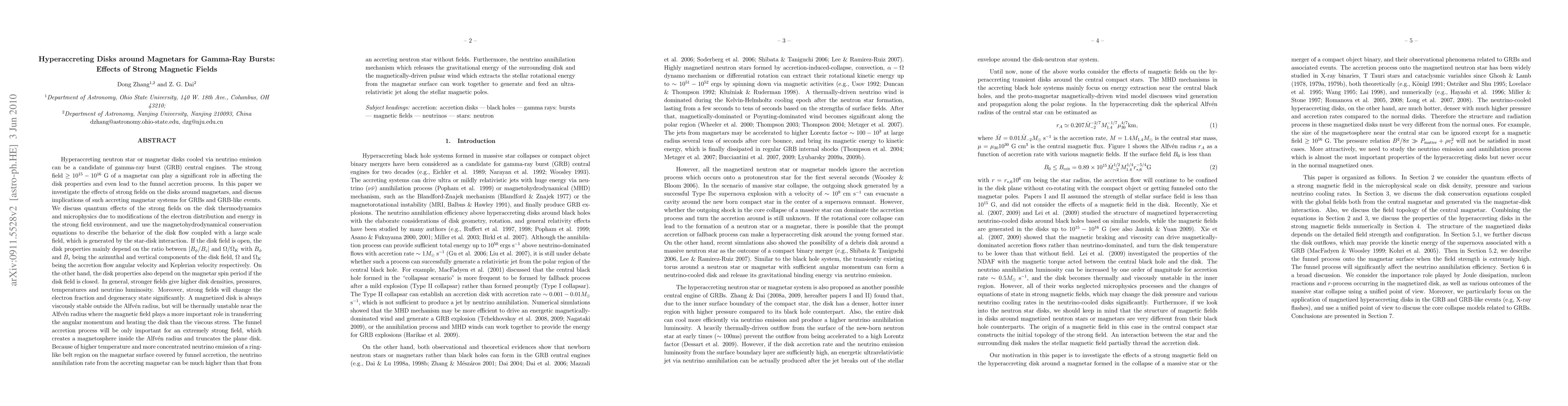 (Abridged) The hyperaccreting neutron star or magnetar disks cooled via neutrino emission can be a candidate of gamma-ray burst (GRB) central engines. The strong field $\geq10^{15}-10^{16}$ G of the magnetar can play a significant role in affecting the disk properties and even lead to the funnel accretion process. We investigate the effects of strong fields on the disks around magnetars, and discuss implications of such accreting magnetar systems for GRB and GRB-like events. We discuss quantum effects of the strong fields on the disk, and use the MHD conservation equations to describe the behavior of the disk flow coupled with a large scale field, which is generated by the star-disk interaction. In general, stronger fields give higher disk densities, pressures, temperatures and neutrino luminosity, and change the electron fraction and degeneracy state significantly. A magnetized disk is always viscously stable outside the Alfv\'{e}n radius, but will be thermally unstable near the Alfv\'{e}n radius where the magnetic field plays a more important role in transferring the angular momentum and heating the disk than the viscous stress. The funnel accretion process will be only important for an extremely strong field, which creates a magnetosphere inside the Alfv\'{e}n radius and truncates the plane disk. Because of higher temperature and more concentrated neutrino emission of the magnetar surface ring-like belt region covered by funnel accretion, the neutrino annihilation rate from the accreting magnetars can be much higher than that from accreting neutron stars without fields. Furthermore, the neutrino annihilation mechanism and the magnetically-driven pulsar wind from the magnetar surface can work together to generate and feed an ultra-relativistic jet along the stellar magnetic poles.