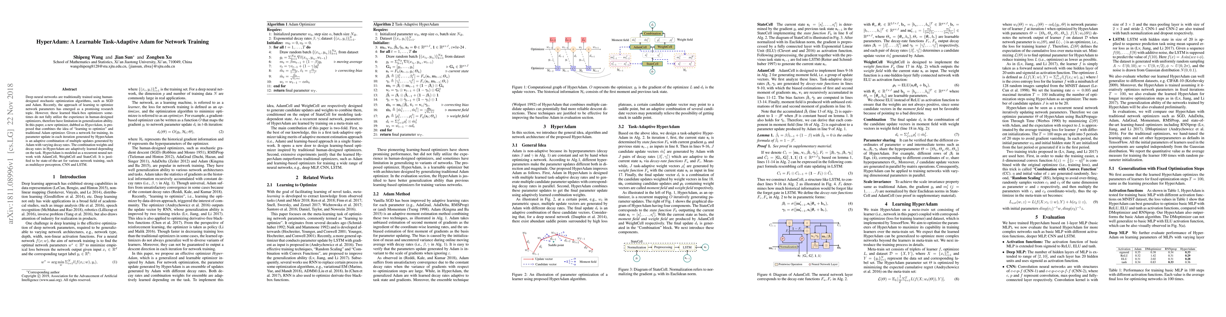 Deep neural networks are traditionally trained using human-designed stochastic optimization algorithms, such as SGD and Adam. Recently, the approach of learning to optimize network parameters has emerged as a promising research topic. However, these learned black-box optimizers sometimes do not fully utilize the experience in human-designed optimizers, therefore have limitation in generalization ability. In this paper, a new optimizer, dubbed as \textit{HyperAdam}, is proposed that combines the idea of "learning to optimize" and traditional Adam optimizer. Given a network for training, its parameter update in each iteration generated by HyperAdam is an adaptive combination of multiple updates generated by Adam with varying decay rates. The combination weights and decay rates in HyperAdam are adaptively learned depending on the task. HyperAdam is modeled as a recurrent neural network with AdamCell, WeightCell and StateCell. It is justified to be state-of-the-art for various network training, such as multilayer perceptron, CNN and LSTM.
