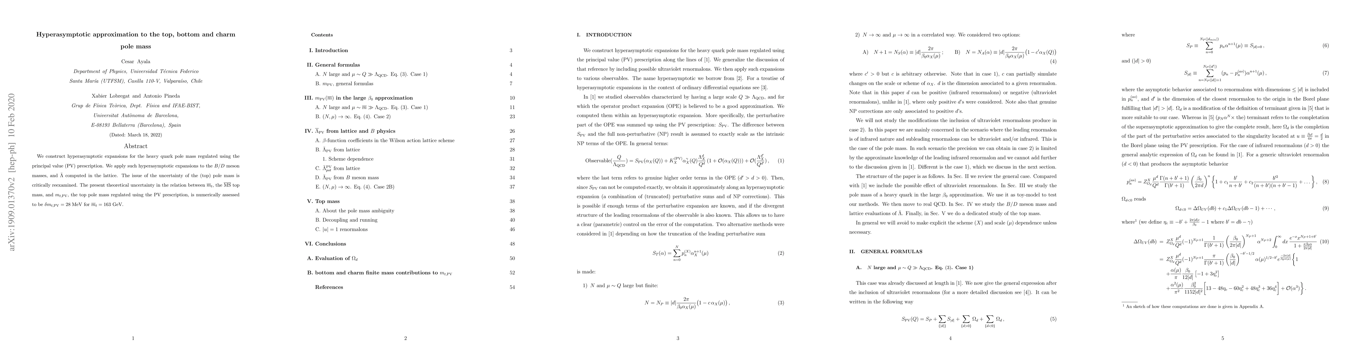 We construct hyperasymptotic expansions for the heavy quark pole mass regulated using the principal value (PV) prescription. We apply such hyperasymptotic expansions to the $B/D$ meson masses, and $\bar \Lambda $ computed in the lattice. The issue of the uncertainty of the (top) pole mass is critically reexamined. The present theoretical uncertainty in the relation between ${\bar m}_t$, the $\bar{\rm MS}$ top mass, and $m_{t, \rm PV}$, the top pole mass regulated using the PV prescription, is numerically assessed to be $\delta m_{t,\rm PV}= 28\;{\rm MeV}$ for ${\bar m}_t =163$ GeV.
