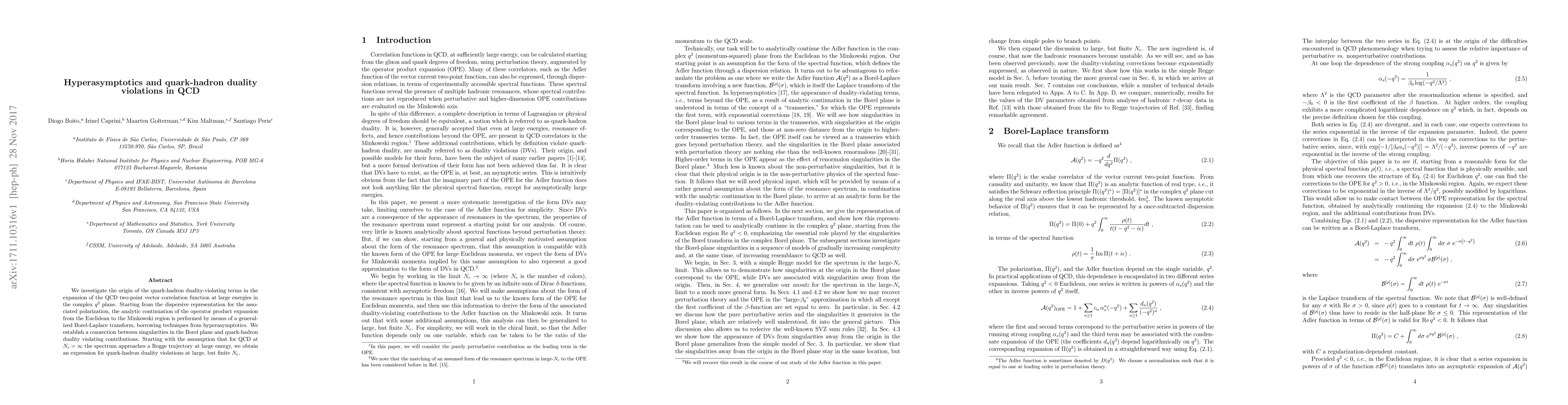 We investigate the origin of the quark-hadron duality-violating terms in the expansion of the QCD two-point vector correlation function at large energies in the complex $q^2$ plane. Starting from the dispersive representation for the associated polarization, the analytic continuation of the operator product expansion from the Euclidean to the Minkowski region is performed by means of a generalized Borel-Laplace transform, borrowing techniques from hyperasymptotics. We establish a connection between singularities in the Borel plane and quark-hadron duality violating contributions. Starting with the assumption that for QCD at $N_c=\infty$ the spectrum approaches a Regge trajectory at large energy, we obtain an expression for quark-hadron duality violations at large, but finite $N_c$.