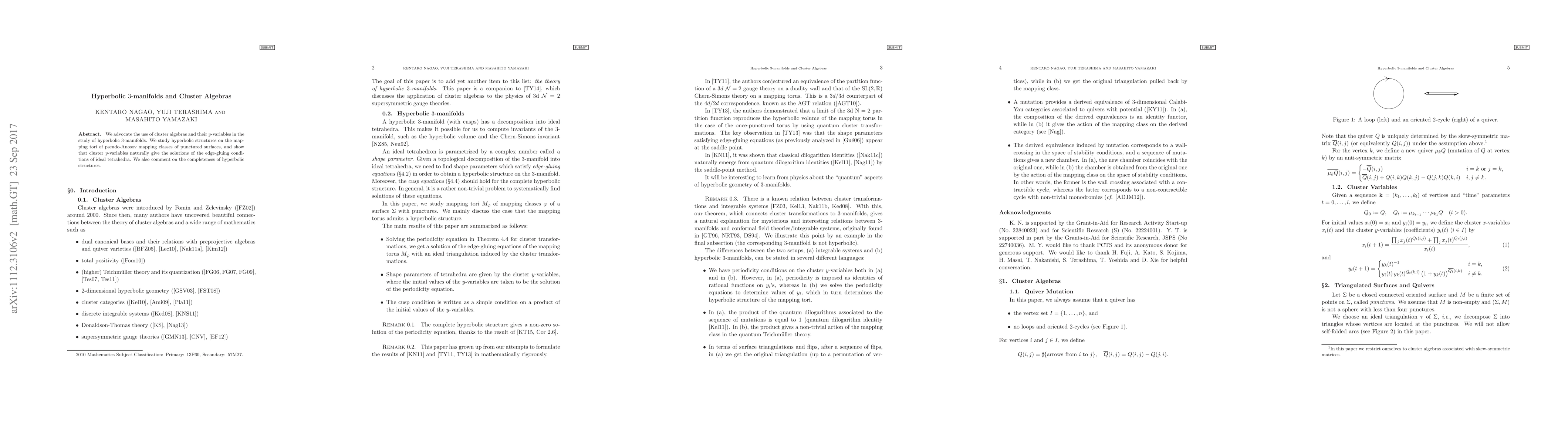 This paper explores the application of cluster algebras and their y-variables to hyperbolic 3-manifolds, demonstrating that these variables provide solutions to the edge-gluing conditions of ideal tetrahedra in mapping tori of pseudo-Anosov mapping classes. It also discusses the completeness of the resulting hyperbolic structures.