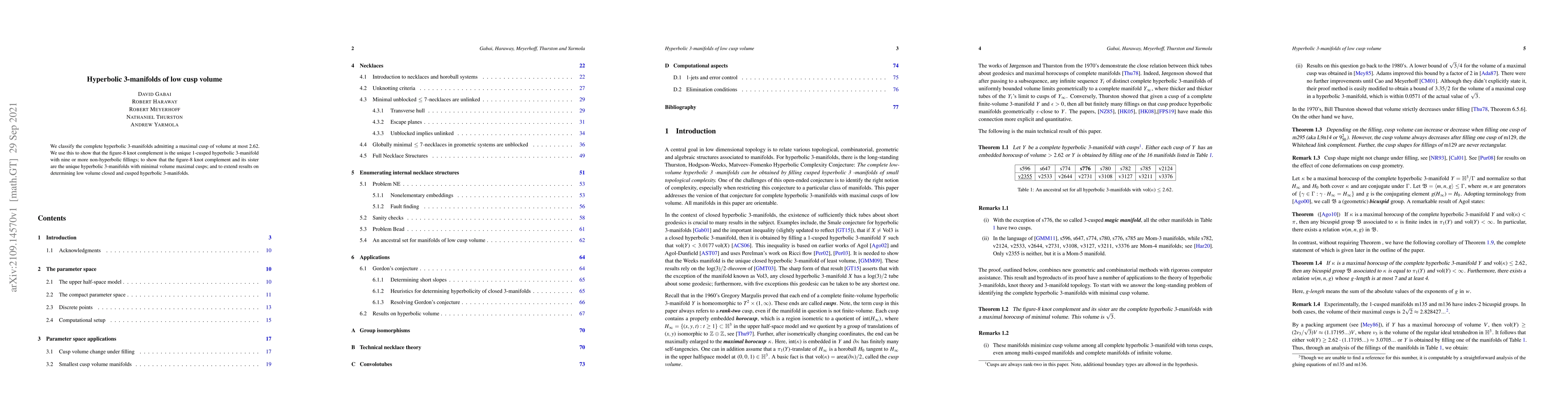 We classify the complete hyperbolic 3-manifolds admitting a maximal cusp of volume at most 2.62. We use this to show that the figure-8 knot complement is the unique 1-cusped hyperbolic 3-manifold with nine or more non-hyperbolic fillings; to show that the figure-8 knot complement and its sister are the unique hyperbolic 3-manifolds with minimal volume maximal cusps; and to extend results on determining low volume closed and cusped hyperbolic 3-manifolds.