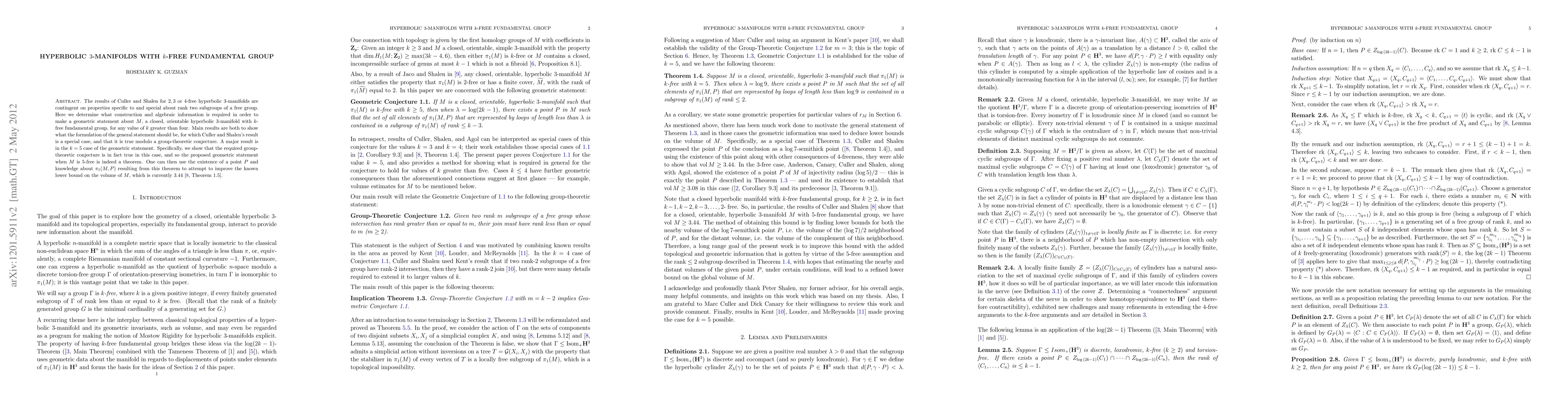 The results of Culler and Shalen for 2,3 or 4-free hyperbolic 3-manifolds are contingent on properties specific to and special about rank two subgroups of a free group. Here we determine what construction and algebraic information is required in order to make a geometric statement about $M$, a closed, orientable hyperbolic 3-manifold with $k$-free fundamental group, for any value of $k$ greater than four. Main results are both to show what the formulation of the general statement should be, for which Culler and Shalen's result is a special case, and that it is true modulo a group-theoretic conjecture. A major result is in the $k=5$ case of the geometric statement. Specifically, we show that the required group-theoretic conjecture is in fact true in this case, and so the proposed geometric statement when $M$ is 5-free is indeed a theorem. One can then use the existence of a point $P$ and knowledge about $\pi_1(M,P)$ resulting from this theorem to attempt to improve the known lower bound on the volume of $M$, which is currently 3.44.