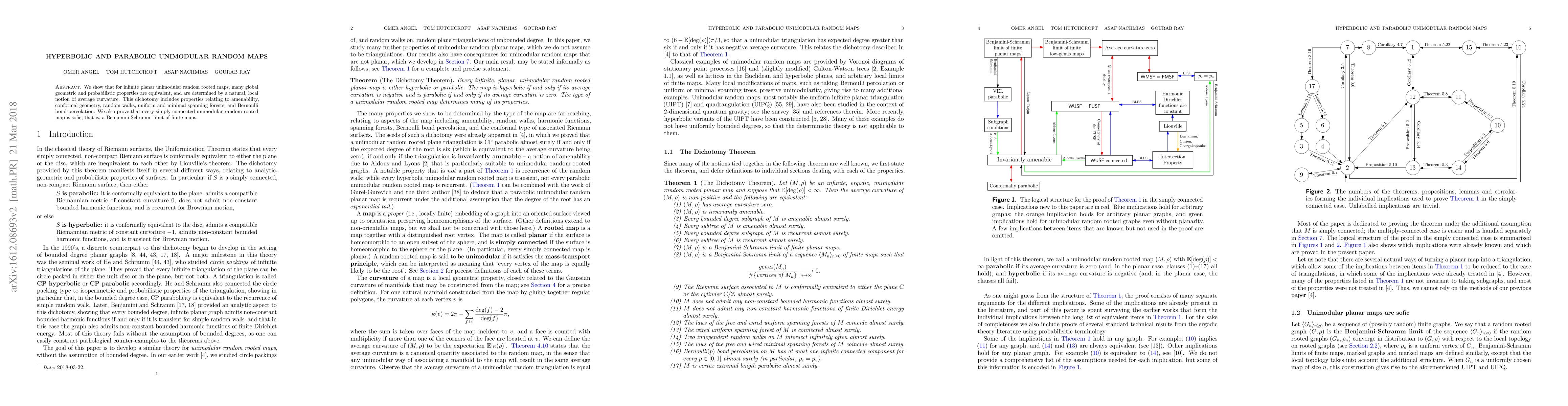 We show that for infinite planar unimodular random rooted maps, many global geometric and probabilistic properties are equivalent, and are determined by a natural, local notion of average curvature. This dichotomy includes properties relating to amenability, conformal geometry, random walks, uniform and minimal spanning forests, and Bernoulli bond percolation. We also prove that every simply connected unimodular random rooted map is sofic, that is, a Benjamini-Schramm limit of finite maps.
