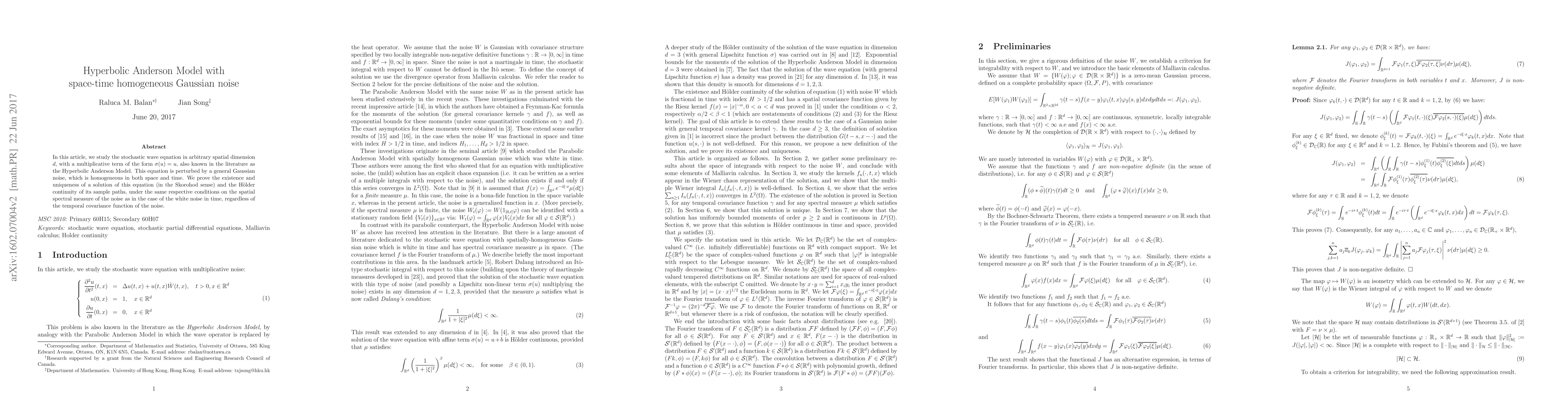 This paper investigates the stochastic wave equation in the Hyperbolic Anderson Model with a multiplicative term $\sigma(u)=u$ and a space-time homogeneous Gaussian noise. It proves the existence and uniqueness of a solution, along with the H\"older continuity of its sample paths, irrespective of the temporal covariance function of the noise.