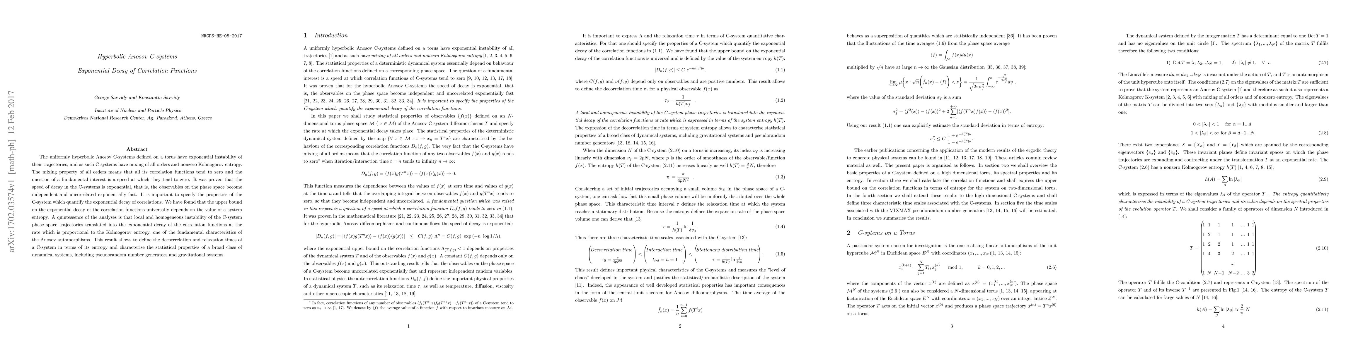 Hyperbolic Anosov C-systems exhibit exponential decay of correlation functions, with the rate of decay proportional to the system's entropy, enabling the characterization of statistical properties in pseudorandom number generators and gravitational systems.