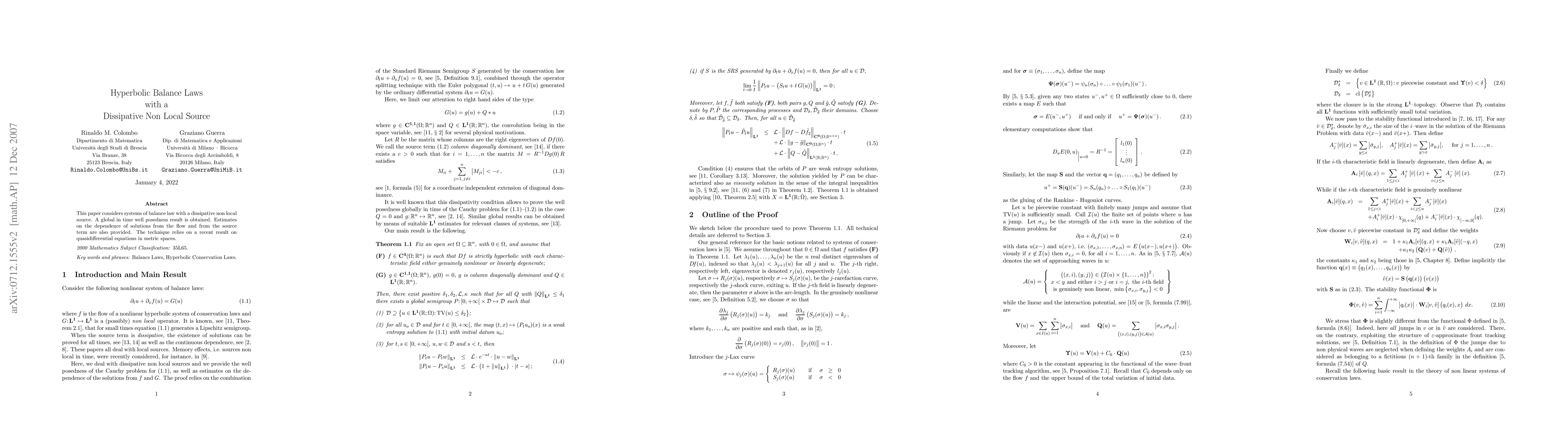 This paper proves global in time well-posedness of balance laws with a dissipative non-local source and estimates the dependence of solutions on flow and source terms. It uses recent results from quasidifferential equations in metric spaces to achieve this result.