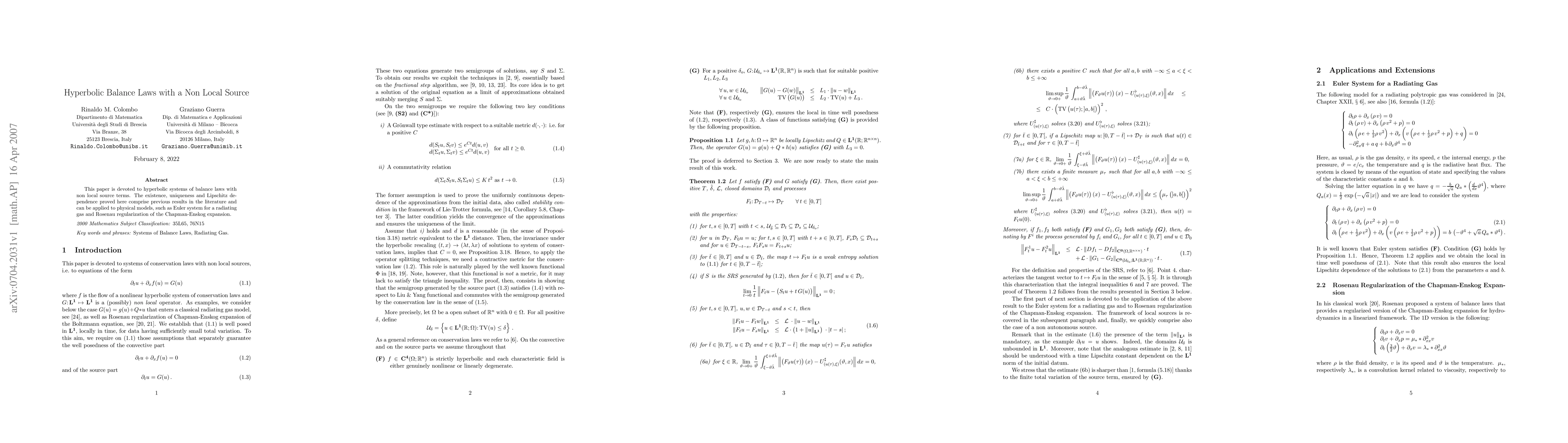 This paper investigates hyperbolic balance laws with non-local source terms, proving existence, uniqueness, and Lipschitz dependence, applicable to physical models like Euler system for radiating gases.